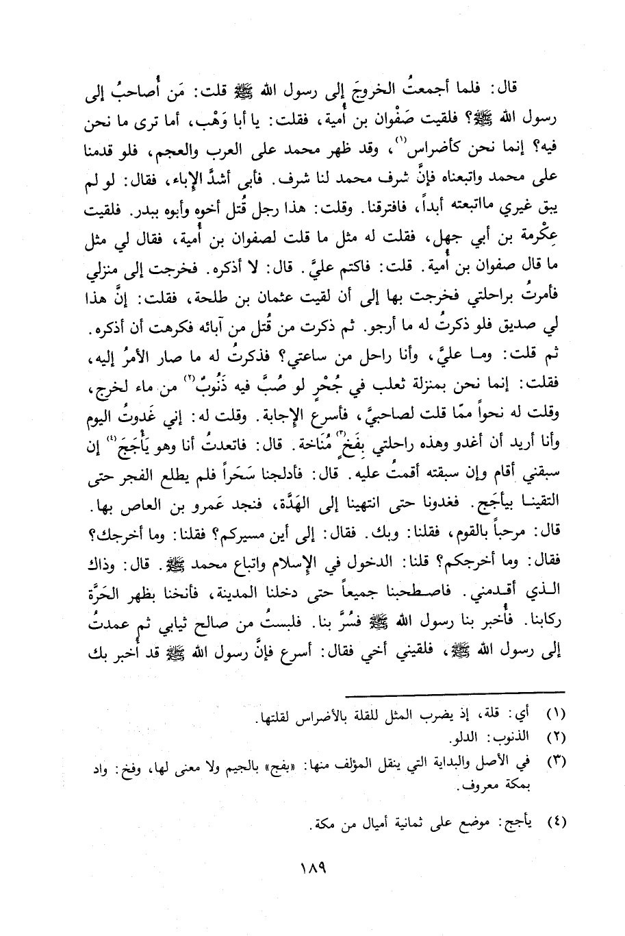قال: فلما أجمعت الخروج إِلى رسول الله صلى الله عليه وسلم قلت: من أصاحب إلى رسول الله صلى الله عليه وسلم فلقيت صفوان بن أُمية، فقلت: يا أبا وَهْب، أما ترى ما نحن فيه؟ إنما نحن كأضراس، وقد ظهر محمد على العرب والعجم. فلو قدمنا على محمد واتبعناه فإنَّ شرف محمد لنا شرف. فأبى أشدَّ الإِباء، فقال: لو لم يبق غيري ما اتبعته أبداً، فافترقنا. وقلت: هذا رجل قُتل أخوه وأبوه ببدر. فلقيت عِكْرمة بن أبي جهل، فقلت له مثل ما قلت لصفوان بن أُمية، فقال لي مثل ما قال صفوان بن أُمية. قلت: فاكتم عليَّ. قال: لا أذكره، فخرجت إلى منزلي فأمرت براحلتين فخرجت بها إلى أن لقيت عثمان بن طلحة. فقلت؛ إنَّ هذا لي صديق فلو ذكرت له ما أرجو. ثم ذكرت من قُتل من آبائه فكرهت أن أذكِّره. ثم قلت: وما عليَّ؟ وأنا راحل من ساعتي. فذكرت له ما صار الأمرُ إليه، فقلت: إنما نحن بمنزلة ثعلب في جحر لو صُبَّ فيه ذَنُوبٌ من ماء لخرج، وقلت له نحواً ممّا قلت لصاحبيَّ، فأسرع الإِجابة. وقلت له: إني غدوت اليوم وأنا أريد أن أغدو وهذه راحلتي بفجِّ مَنَاخة. قال: فاتعدت أنا وهو يأجُجَ إن سبقني أقام وإن سبقته أقمت عليه. قال: فأدلجنا سَحَراً فلم يطلع الفجر حتى التقينا بيأجج. فغدونا حتى انتهينا إلى الهدّة، فنجد عمرو بن العاص بها. قال: مرحباً بالقوم، فقلنا: وبك. فقال إلى أين مسيركم؟ فقلنا: وما أخرجك؟ فقال: وما أخرجكم؟ قلنا: الدخول في الإِسلام واتباع محمد صلى الله عليه وسلم قال: وذاك الذي أقدمني. فاصطحبنا جميعاً