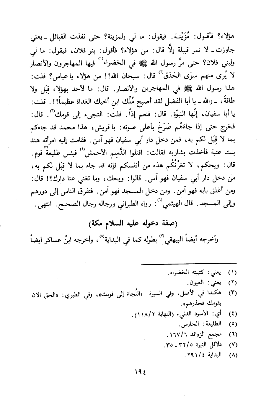 هؤلاء؟ فقول: مُزَيْنة. فيقول: ما لي ولمزينة؟ حتى نفدت القبائل - يعني جاوزت - لا تمر قبيلة إلا قال: من هؤلاء؟ فأقول: بنو فلان، فيقول: ما لي ولبني فلان؟ حتى مرَّ رسول الله صلى الله عليه وسلم في الخضراء فيها المهاجرون والأنصار لا يُرى منهم سوى الحَدَق قال: سبحان الله من هؤلاء يا عباس؟ قلت: هذا رسول الله صلى الله عليه وسلم في المهاجرين والأنصار. قال: ما لأحد بهؤلاء قِبَل ولا طاقةٌ، - والله - يا أبا الفضل لقد أصبح ملك ابنِ أخيك الغداة عظيماً. قلت: يا أبا سفيان، إنّها النبوّة. قال: فنعم إِذاً. قلت: إلتجىء إلى قومك. قال: فخرج حتى جاءهم صرخ بأعلى صوته: يا قريش، هذا محمد قد جاءكم بما لا قِبَل لكم به، فمن دخل دار أبي سفيان فهو آمن. فقامت إليه إمرأته هند بنت عتبة فأخذت بشاربه فقالت: أقتلوا الدَّسِم الأحمش فبئس طليعة قوم. قال: ويحكم، لا تغرَّنَّكُم هذه من أنفسكم فإنه قد جاء بما لا قِبَل لكم به، من دخل دار أبي سفيان فهو آمن. قالوا: ويحك وما تغني عنا دارك؟ قال: ومن أغلق بابه فهو آمن. ومن دخل المسجد فهو آمن. فتفرق الناس إلى دورهم وإلى المسجد. قال الهيثمي: رواه الطبراني ورجاله رجال الصحيح. انتهى.