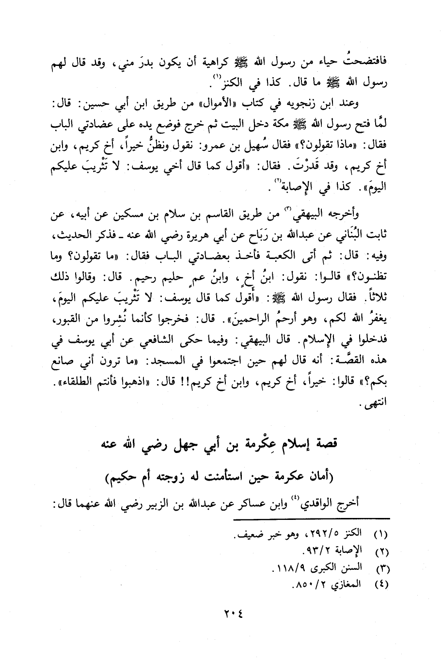 وعند ابن زنجويه في كتاب الأموال من طريق ابن أبي حسين: قال: لمَّا فتح رسول الله صلى الله عليه وسلم مكة دخل البيت ثم خرح فوضع يده على عضادتي الباب فقال: «ماذا تقولون؟» فقال سهيل بن عمرو: نقول ونظنُّ خيراً، أخ كريم، وابن أخ كريم، وقد قَدْرتَ.