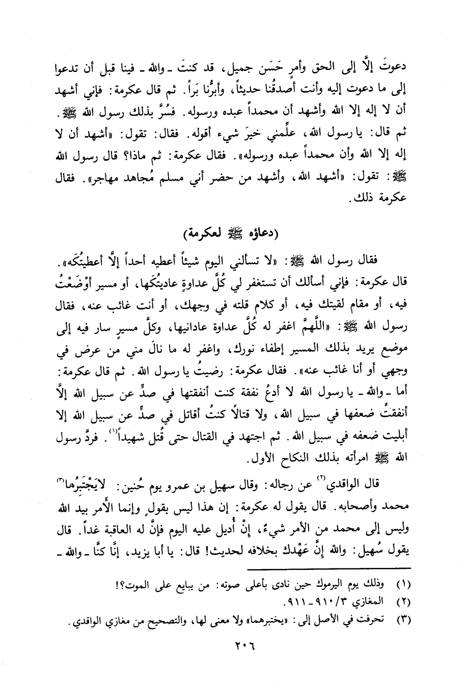 فقال رسول الله: «لا تسألني اليوم شيئاً أعطيه أحداً إلا أعطيتُكَه» . قال عكرمة: فإني أسألك أن تستغفر لي كل عداوة عاديتُكَها، أو مسير أوْضَعْتُ فيه، أو مقام لقيتك فيه، أو كلام قلته في وجهك، أو أنت غائب عنه، فقال رسول الله صلى الله عليه وسلم «اللَّهمَّ إغفر له كل عداوة عادانيها، وكل مسير سار فيه إلى موضع يريد بذلك المسير إطفاء نورك، واغفر له ما نال مني من عرض في وجهي أو أنا غائب عنه» . فقال عكرمة: رضيتُ يا رسول الله. ثم قال عكرمة: أما - والله - يا رسول الله لا أدُع نفقة كنت أنفقتها في صدَ عن سبيل الله إلا أنفقت ضعفها في سبيل الله، ولا قتالاً كنت أقاتل في صدَ عن سبيل الله إلا أبليت ضعفه في سبيل الله. ثم اجتهد في القتال حتى قُتل شهيداً. فردَّ رسول الله صلى الله عليه وسلم إمرأته بذلك النكاح الأول. قال الواقدي عن رجاله؛ وقال سهيل بن عمرو يوم حُنين: لا يختبرهما محمد وأصحابه. قال يقول له عكرمة: إن هذا ليس يقول إنما الأمر بيد الله وليس إلى محمد من الأمر شيء، إِنْ أُديل عليه اليوم فإنَّ له العاقبة غداً. قال يقول سهيل: والله إنَّ عهدك بخلافه لحديث، قال: يا أبا يزيد، إنَّا كنَّا - والله -