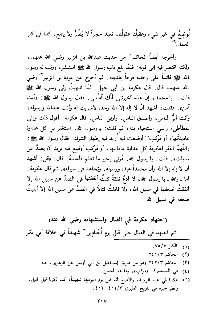 وأخرجه أيضاً الحاكم من حديث عبد الله بن الزبير رضي الله عنهما، ولكنه اقتصر فيه إلى قوله: فلمَّا بلغ باب رسول الله صلى الله عليه وسلم استبشر، ووثب له رسول الله صلى الله عليه وسلم قائماً على رجليه فرحاً بقدومه. ثم أخرج عن عروة بن الزبير رضي الله عنهما قال: قال عكرمة بن أبي جهل: لمَّا انتهيت إِلى رسول الله صلى الله عليه وسلم قلت: يا محمد، إِنَّ هذه أخبرتني أنَّك آمنْتني. فقال رسول الله صلى الله عليه وسلم «أنت آمن» . فقلت: أشهد أنْ لا إله إلا الله وحده لا شريك له وأنت عبد الله ورسوله، وأنت أبرُّ الناس، وأصدق الناس، وأوفى الناس. قال عكرمة: أقول ذلك وإني لمطأطىء رأسي إستحياءً منه، ثم قلت: يا رسول الله، إستغفر لي كل عداوة عاديتكَها، أو مَرْكب أوضعت فيه أُريد فيه إظهار الشرك. فقال رسول الله صلى الله عليه وسلم «اللَّهمَّ إغفر لعكرمة كل عداوة عادانيها، أو مَرْكب أوضع فيه ييد أن يصدَّ عن سبيلك» . قلت: يا رسول الله، مُرني بخير ما تعلم فأعلمهُ. قال: «قل: أشهد أن لا إله إلا الله وأن محمداً عبده ورسوله، وتجاهد في سبيله» . ثم قال عكرمة: أما - والله - يا رسول الله، لا أدع نفقة كنت أنفقتها في الصدِّ عن سبيل الله إلا أنفقت ضعفها في سبيل الله، ولا قاتلت قتالاً في الصدِّ عن سبيل الله إلا أبليت ضعفه في سبيل الله.