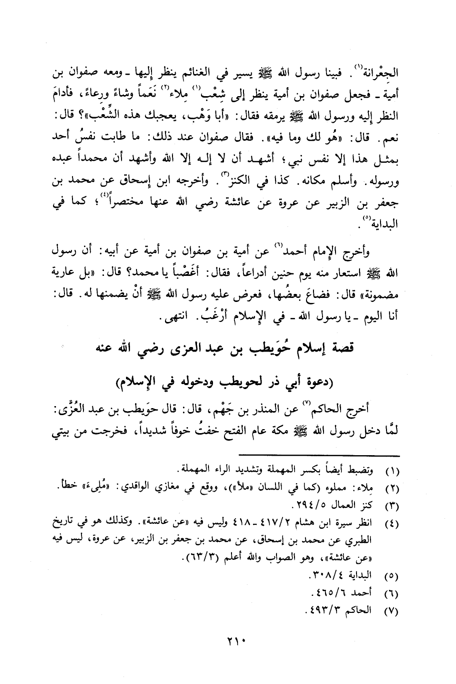 وأخرج الإِمام أحد عن أمية بن صفوان بن أمية عن أبيه: أن رسول الله صلى الله عليه وسلم استعار منه يوم حنين أدراعاً، فقال: أغَصْباً يا محمد؟ قال: «بل عارية مضمونة» قال: فضاع بعضها، فعرض عليه رسول الله صلى الله عليه وسلم أنْ يضمنها له. قال: أنا اليوم - يا رسول الله - في الإِسلام أَرْغَبُ. انتهى.