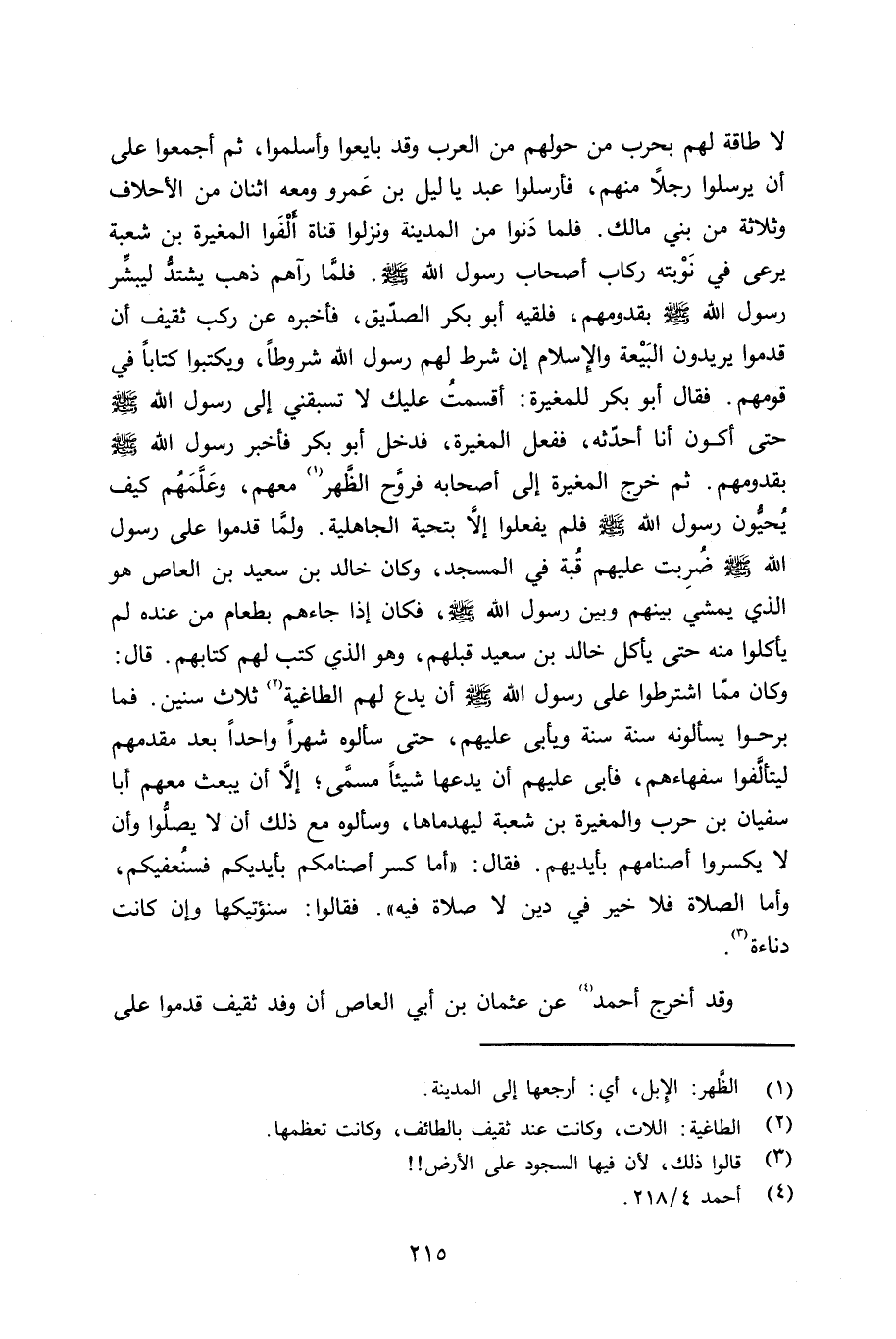 لا طاقة لهم بحرب من حولهم من العرب وقد بايعوا وأسلموا، ثم أجمعوا على أن يرسلوا رجلاً منهم، فأرسلوا عبد يا ليل بن عمرو ومعه إثنان من الأحلاف وثلاثة من بني مالك. فلما دنَوا من المدينة ونزلوا قناة ألفَوا المغيرة بن شعبة يرعى في نَوْبته ركاب أصحاب رسول الله صلى الله عليه وسلم فلمَّا رآهم ذهب يشتدُّ ليبشِّر رسول الله صلى الله عليه وسلم بقدومهم، فلقيه أبو بكر الصدّيق رضي الله عنه، فأخبره عن ركب ثقيف أن قدموا يريدون البَيْعة والإِسلام إن شرط لهم رسول الله شروطاً، ويكتبوا كتاباً إلى قومهم. فقال أبو بكر للمغيرة: أقسمتُ عليك لا تسبقني إلى رسول الله صلى الله عليه وسلم حتى أكون أنا أحدّثه، ففعل المغيرة، فدخل أبو بكر فأخبر رسول الله صلى الله عليه وسلم بقدومه. ثم خرج المغيرة إلى أصحابه فروَّح الظَّهر معه، وعلمهم كيف يُحيُّون رسول الله صلى الله عليه وسلم فلم يفعلوا إلا بتحية الجاهلية. ولمَّا قدموا على رسول الله صلى الله عليه وسلم ضربت عليه قُبة في المسجد، وكان خالد بن سعيد بن العاص هو الذي يمشي بينهم وبين رسول الله صلى الله عليه وسلم فكان إِذا جاءهم بطعام من عنده لم يأكلوا منه حتى يأكل خالد بن سعيد قبلهم، وهو الذي كتب لهم كتابه. قال: وكان ممّا اشترطوا على رسول الله صلى الله عليه وسلم أن يدع لهم الطاغية ثلاث سنين. فما برحوا يسألونه سنة سنة ويأبى عليه، حتى سألوه شهراً واحداً بعد مقدمهم ليتألَّفوا سفهاءه، فأبى عليهم أن يدعها شيئاً مسمَّى؛ إلا أن يبعث معهم أبا سفيان بن حرب والمغيرة بن شعبة ليهدماها، وسأله مع ذلك أن لا يصلُّوا وأن لا يكسروا أصنامهم بأيديهم. فقال: «أما كسر أصنامكم بأيديكم فسنُعفيكم، وأما الصلاة فلا خير في دين لا صلاة فيه» . فقالوا: سنؤتيكها وإن كانت دناءة.