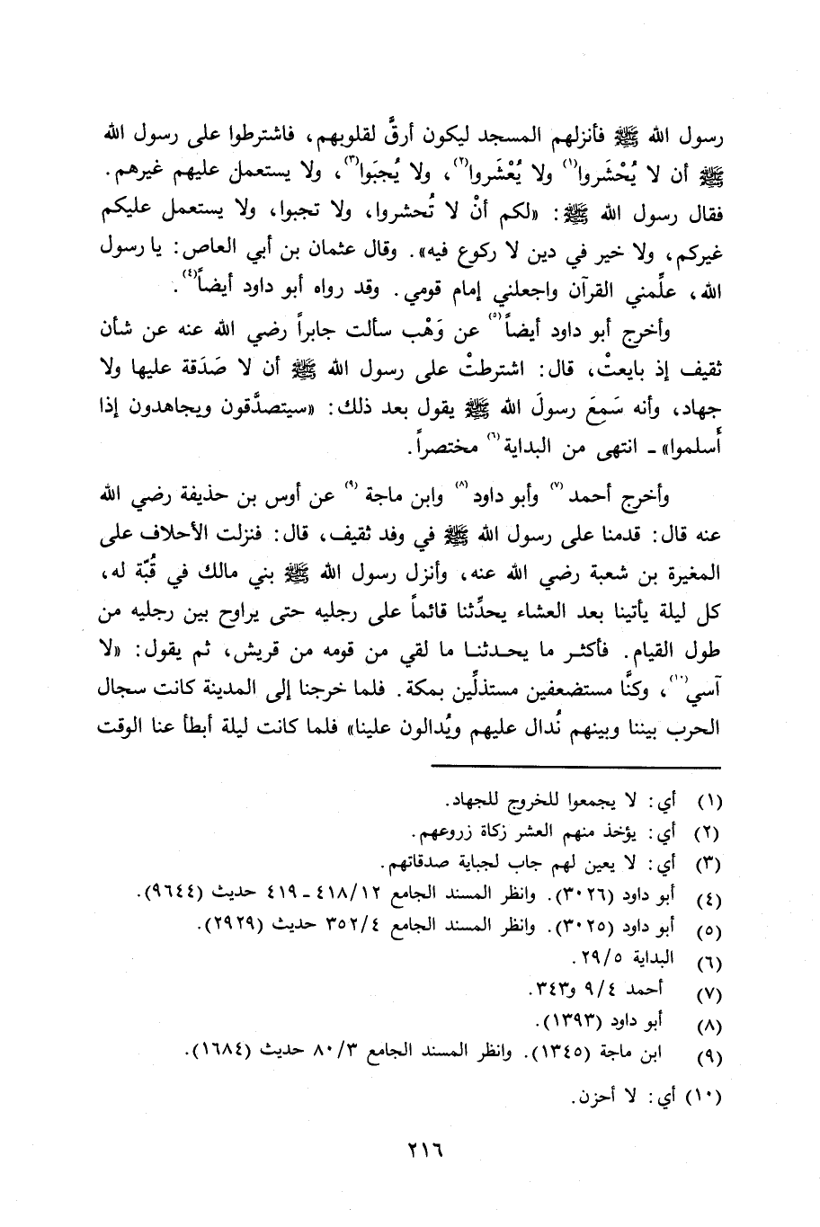 وأخرج أبو داود أيضاً عن وَهْب سألت جابراً رضي الله عنه عن شأن ثقيف إذ بايعتْ، قال: اشترطتْ على رسول الله صلى الله عليه وسلم أن لا صدقة عليها ولا جهاد، وأنه سمع رسول الله صلى الله عليه وسلم يقول بعد ذلك: «سيتصدَّقون ويجاهدون إذا أسلموا» - انتهى من البداية مختصراً.