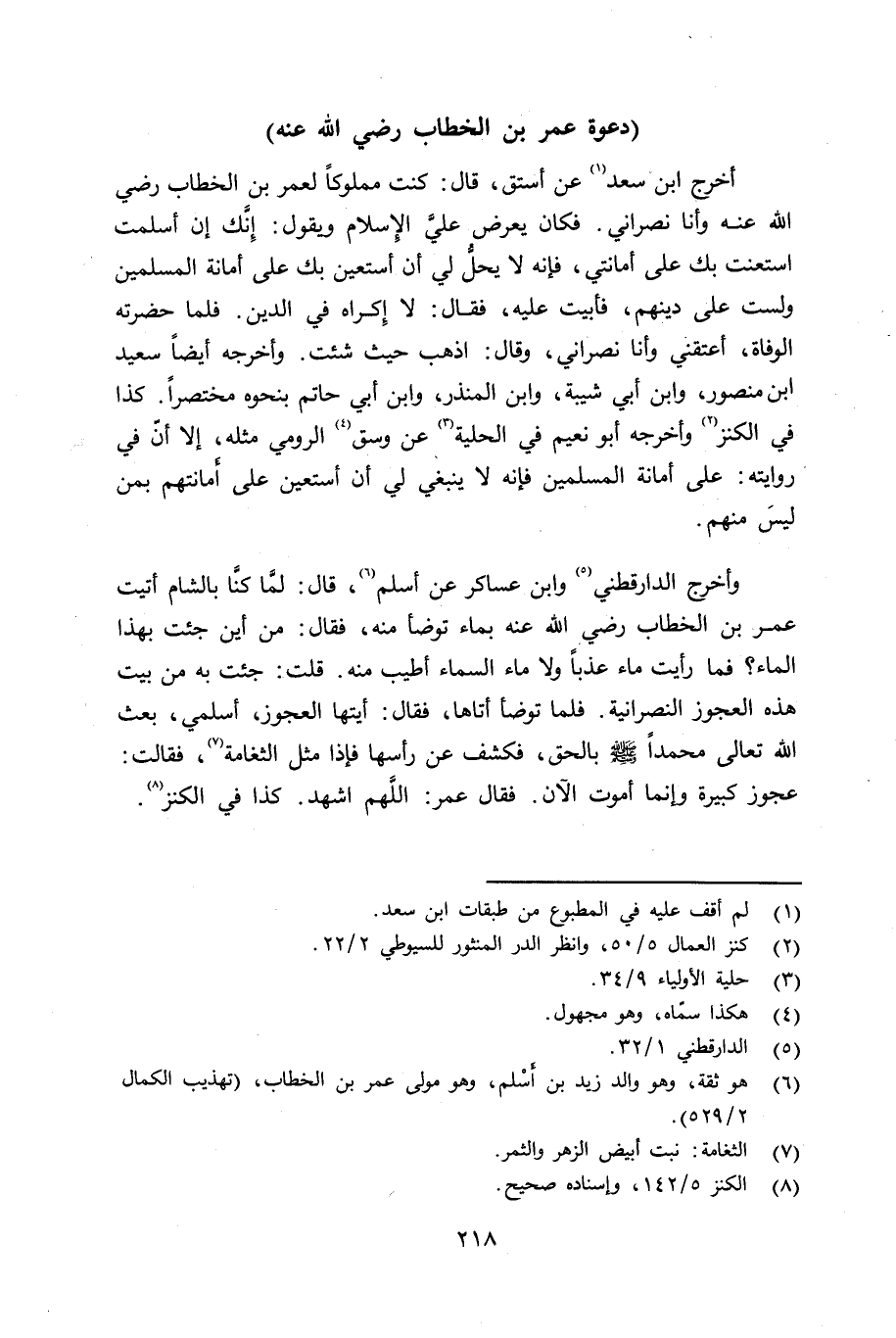 وأخرج الدارقطني، وابن عساكر عن أسلم قال: لمَّا كنَّا بالشام أتيت عمر بن الخطاب رضي الله عنه بماء توضأ منه. فقال: من أين جئت بهذا الماء؟ فما رأيت ماء عذباً ولا ماء السماء أطيب منه. قلت: جئت به من بيت هذه العجوز النصرانية. فلما توضأ أتاها فقال: أيتها العجوز، أسلمي، بعث الله تعالى محمداً صلى الله عليه وسلم بالحق، فكشفت عن رأسها فإذا مثل الثغامة، فقالت: عجوز كبيرة وإنما أموت الآن. فقال عمر: اللَّهم أشهد. كذا في الكنز.