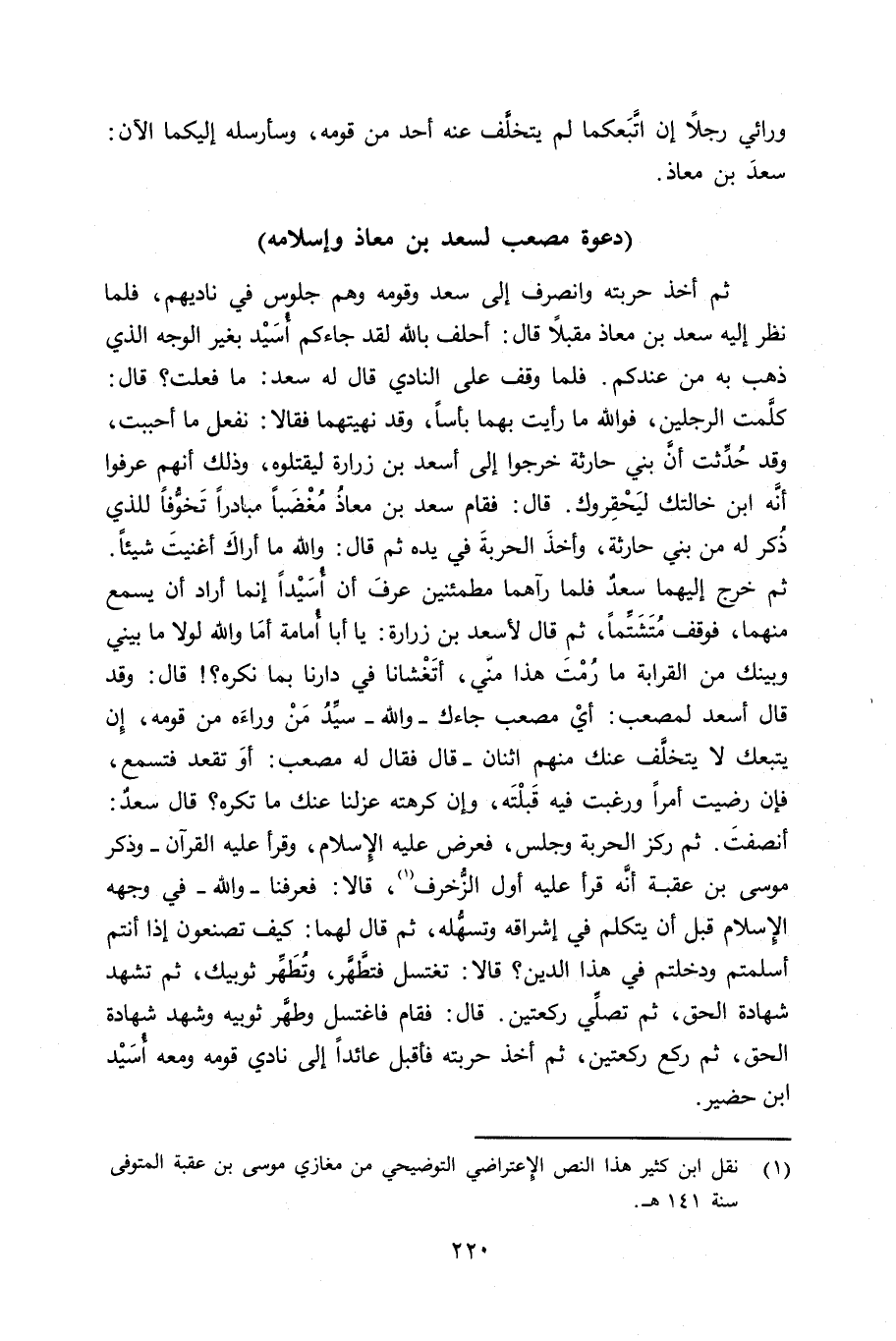 ثم أخذ حربته وانصرف إلى سعد وقومه وهم جلوس في ناديهم، فلما نظر إليه سعد بن معاذ مقبلاً قال: أحلف بالله لقد جاءكم أُسَيْد بغير الوجه الذي ذهب به من عندكم. فلما وقف على النادي قال له سعد: ما فعلت؟ قال: كلَّمت الرجلين، فوالله مارأيت بهما بأساً، وقد نهيتهما فقالا: نفعل ما أحببت، وقد حُدِّثت أنَّ بني حارثة خرجوا إلى أسعد بن زرارة ليقتلوه، وذلك أنهم عرفوا أنَّه ابن خالتك ليَحْقِروك. قال: فقام سعد بن معاذُ مُغْضَباً مبادراً تَخوُّفاً للذي ذُكر له من بني حارثة، وأخذ الحربة في يده ثم قال: والله ما أراك أغنيت شيئاً. ثم خرج إليهما سعد فلما رآها مطمئنين عرف أن أسَيْداً إنما أراد أن يسمع منهما، فوقف مُتَشَمِّتاً، ثم قال لأسعد بن زرارة: يا أبا أُمامة أمَا والله لولا ما بيني وبينك من القرابة ما رُمْتَ هذا منِّي، أتَغْشانا في دارنا بما نكره؟ قال: وقد قال أسعد لمصعب: أيْ مصعب جاءك - والله - سيِّدُ مَنْ وراءَه من قومه، إِن يتبعك لا يتخلَّف عنك منهم إثنان - قال فقال له مصعب: أوَ تقعد فتسمع، فإن رضيت أمراً ورغبت فيه قَبلْتَه، وإن كرهته عزلنا عنك ما تكره؟؟ قال سعد: أنصفت. ثم ركز الحربة وجلس، فعرض عليه الإِسلام، وقرأ عليه القرآن - وذكر موسى بن عقبة أنَّه قرأ عليه أول الزخرف -، قالا: فعرفنا - والله - في وجهه الإِسلام قبل أن يتكلَّم في إشراقه وتسهُّله، ثم قال لهما: كيف تصنعون إذا أنتم أسلمتم ودخلتم في هذا الدين؟ قالا: تغتسل فتطَّهَّر، وتُطَهِّر ثوبيك، ثم تشهد شهادة الحق، ثم تصلِّي ركعتين. قال: فقام فاغتسل وطهَّر ثوبيه وشهد شهادة الحق، ثم ركع ركعتين، ثم أخذ حربته فأقبل عائداً إلى نادي قومه ومعهم أُسَيْد بن حضير.