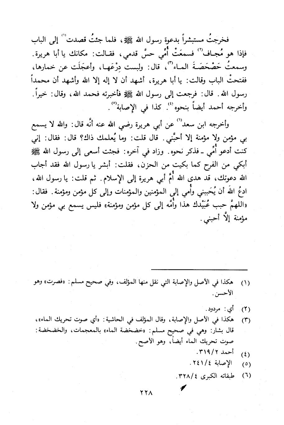 فخرجت مستبشراً بدعوة رسول الله صلى الله عليه وسلم فلما جئت قصدت إلى الباب فإذا هو مُجاف، فسمعت أُمِّي حسَّ قدمي، فقالت: مكانك يا أبا هريرة. وسمعتُ حَصْحَصَة الماء، قال: ولبست دِرْعها، وأعجَلَت عن خمارها، ففتحتْ الباب وقالت: يا أبا هريرة، أشهد أن لا آله إلا الله وأشهد أن محمداً رسول الله. قال فرجعت إلى رسول الله صلى الله عليه وسلم فأخبرته فحمد الله وقال: خيراً. وأخرجه أحمد أيضاً بنحوه. كذا في الإِصابة.