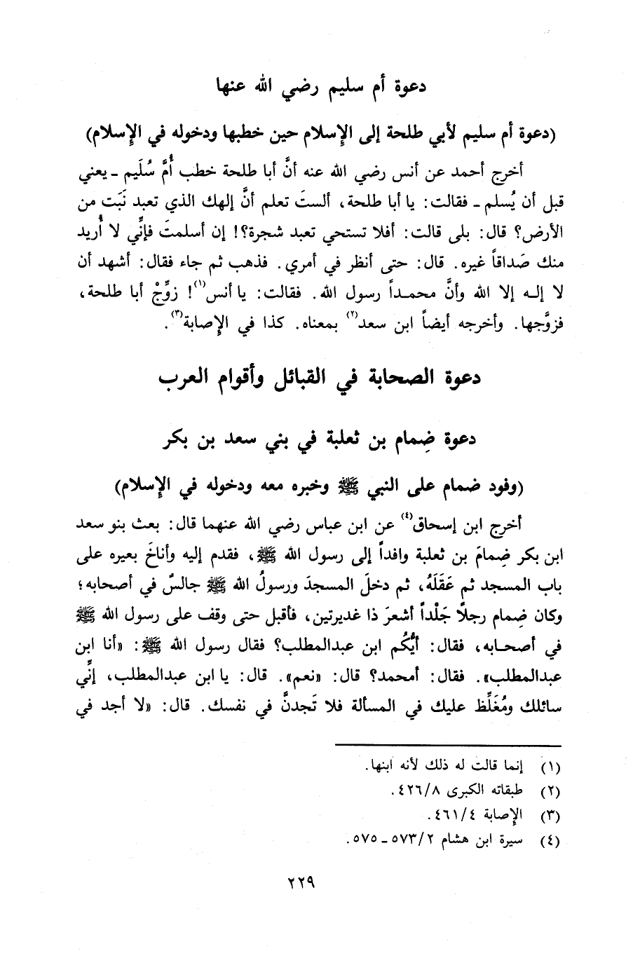 أخرج أحمد عن أنس رضي الله عنه أنَّ أبا طلحة خطب أُمَّ سُلَيم - يعني قبل أن يُسلم - فقالت: يا أبا طلحة، ألستَ تعلم أنَّ إلهك الذي تعبد نَبَت من الأرض؟ قال: بلى قالت: أفلا تستحي تعبد شجرة؟ إن أسلمتَ فإنِّي لا أُريد منك صَداقاً غيره. قال: حتى أنظر في أمري. فذهب ثم جاء فقال: أشهد أن لا إله إلا الله وأنَّ محمداً رسول الله. فقالت: يا أنس زوِّجْ أبا طلحة، فزوَّجها. وأخرجه أيضاً ابن سعد بمعناه. كذا في الإِصابة.
