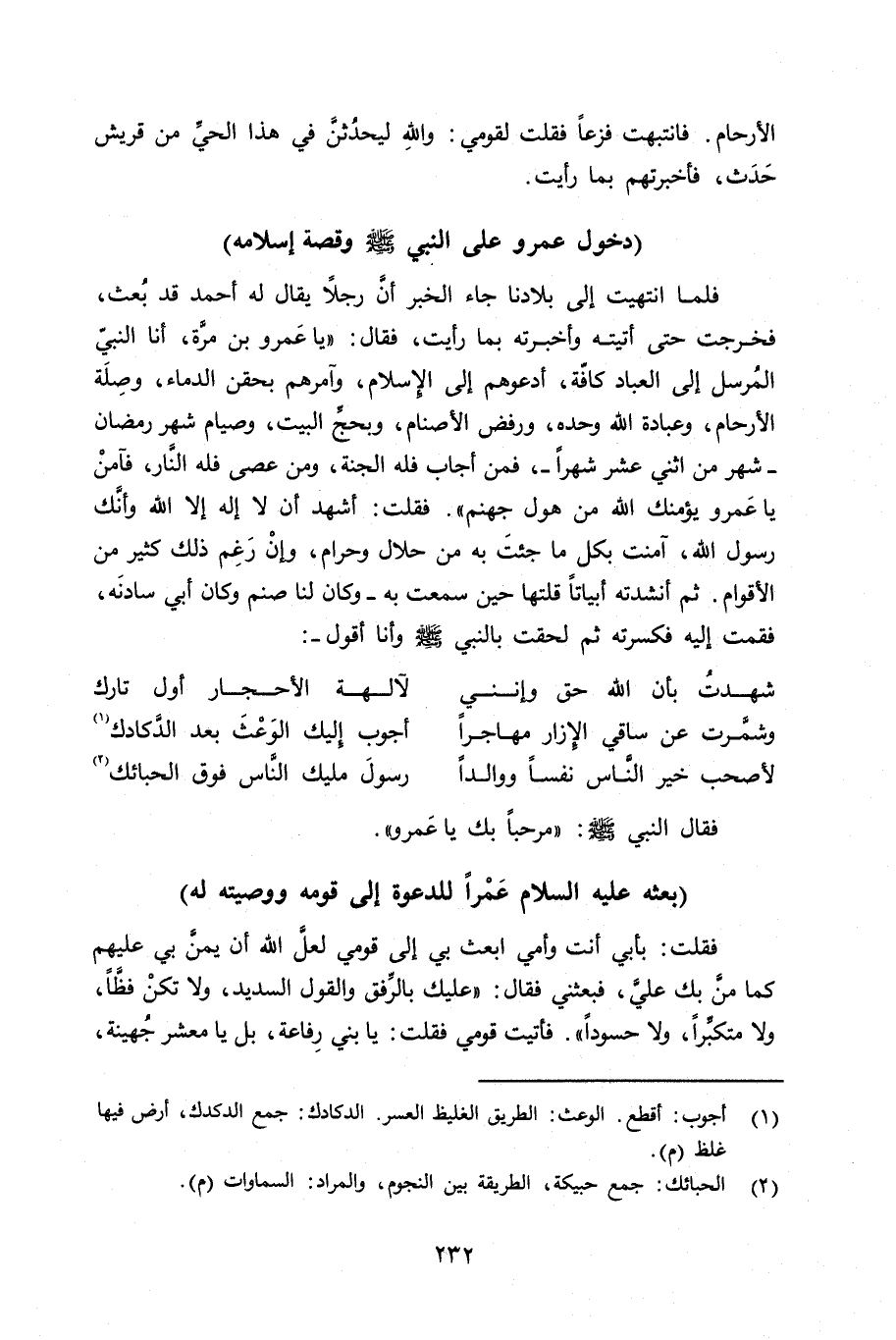 فلما انتهيت إلى بلادنا جاء الخبر أنَّ رجلاً يقال له أحمد قد بُعث، فخرجت حتى أتيته وأخبرته بما رأيت، فقال: «يا عمرو بن مرَّة، أنا النبيّ المرسل إلى العباد كافّة، أدعوهم إلى الإِسلام، وآمرهم بحقن الدماء، وصِلَة الأرحام، وعبادة الله وحده، ورفض الأصنام، وبحجِّ البيت، وصيام شهر رمضان - شهر من إثني عشر شهراً -، فمن أجاب فله الجنة، ومن عصى فله النَّار، فآمن يا عمرو يؤمنك الله من هول جهنم» . فقلت: أشهد أن لا إله إلا الله وأنَّك رسول الله، آمنت بكل ما جئتَ به من حلال وحرام، وإنْ رَغِم ذلك كثير من الأقوام. ثم أنشدته أبياتاً قلتها حين سمعت به - وكان لنا صنم وكان أبي سادنَه، فقمت إليه فكسرته ثم لحقت بالنبي صلى الله عليه وسلم وأنا أقول -: