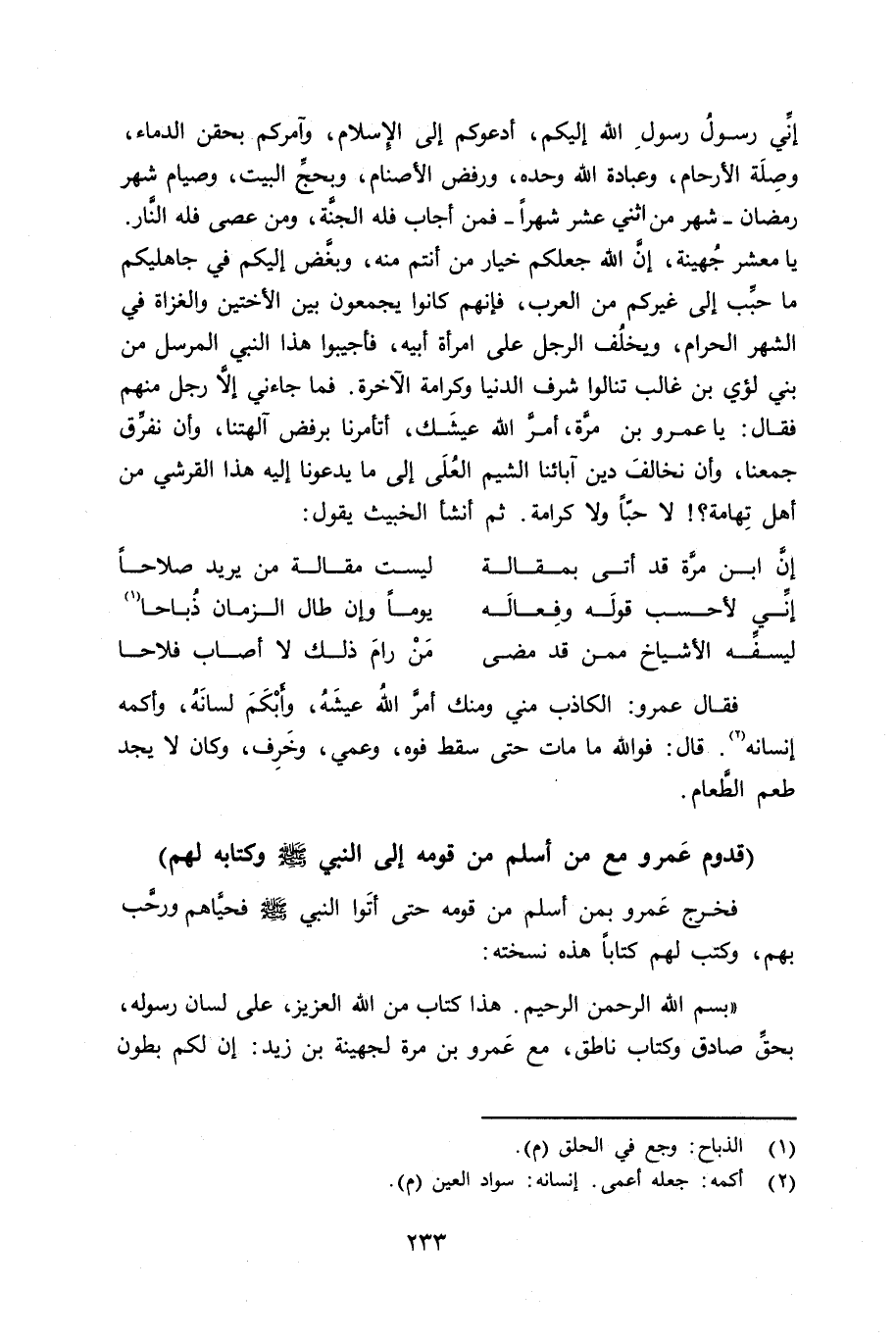 إنِّي رسولُ رسولِ الله إليكم، أدعوكم إلى الإِسلام، وآمركم بحقن الدماء، وصِلَة الأرحام، عبادة الله وحده، ورفض الأصنام، وبحجِّ البيت، وصيام شهر رمضان - شهر من إثني عشر شهراً - فمن أجاب فله الجنَّة، ومن عصى فله النَّار. يا معشر جُهينة، إنَّ الله جعلكم خيار من أنتم منه، وبغَّض إليكم في جاهليكم ما حبِّب إلى غيركم من العرب، فإنهم كانوا يجمعون بين الأختين والغزاة في الشهر الحرام، ويخلُف الرجل على إمرأة أبيه، فأجيبوا هذا النبي المرسل من بني لؤي بن غالب تنالوا شرف الدنيا وكرامة الآخرة. فما جاءني إلا رجل منهم فقال: يا عمرو بن مرَّة، أمرَّ الله عيشَك، أتأمرنا برفض آلهتنا، وأن نفرِّق جمعنا، وأن نخالف دين آبائنا الشيم العلى إلى ما يدعونا إليه هذا القرشي من أهل تِهامة؟ لا حبّاً ولا كرامة. ثم أنشأ الخبيث يقول: