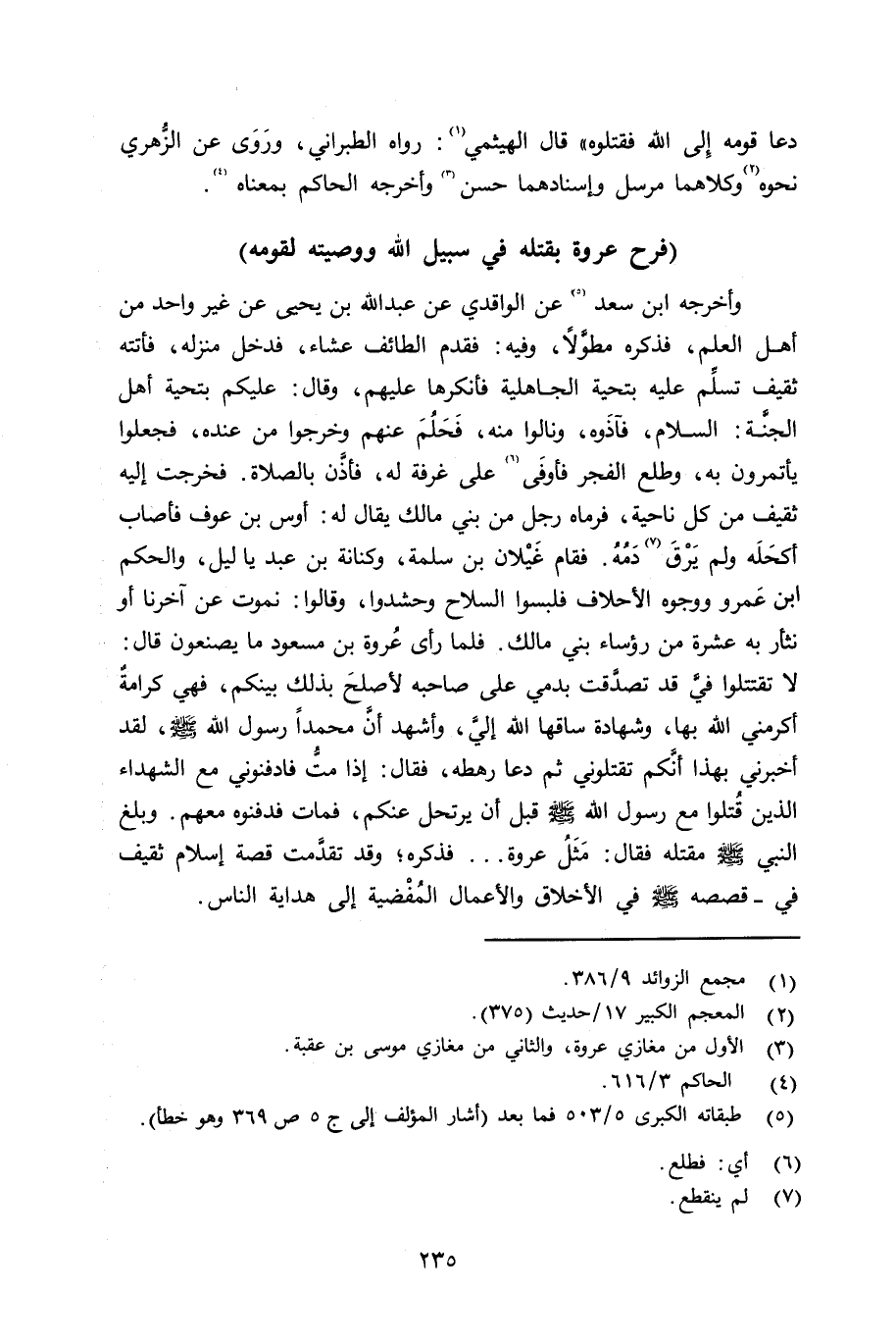 أخرجه ابن سعد عن الواقدي عن عبد الله بن يحيى عن غير واحد من أهل العلم، فذكره مطوَّلاً وفيه: فقدم الطائف عشاء، فدخل منزله، فأتته ثقيف تسلِّم عليه بتحية الجاهلية فأنكرها عليهم وقال: عليكم بتحية أهل الجنَّة: السلام، فآذَوه، ونالوا منه، فحلم عنهم وخرجوا من عنده، فجعلوا أتمرون به، وطلع الفجر فأوفَى على غرفة له، فأذَّن بالصلاة. فخرجت إليه ثقيف من كل ناحية، فرماه رجل من بني مالك يقال له: أوس بن عوف فأصاب أكحَلَه ولم يَرْقَ دمه. فقام غَيْلان بن سلمة، وكنانة بن عبد ياليل، والحكم بن عمرو ووجوه الأخلاف فلبسوا السلاح وحشدوا، وقالوا: نموت عن آخرنا أو نثأر به عشرة من رؤساء بني مالك. فلما رأى عروة بن مسعود ما يصنعون قال: لا تقتتلوا فيَّ قد تصدَّقت بدمي على صاحبه لأصلح بذلك بينكم، فهي كرامة أكرمني الله بها، وشهادة ساقها الله إليَّ، وأشهد أنَّ محمداً رسول الله صلى الله عليه وسلم لقد أخبرني بهذا أنَّكم تقتلوني ثم دعا رهطة فقال: إذا متُّ فادفنوني مع الشهداء الذين قَتلوا مع رسول الله صلى الله عليه وسلم قبل أن يرتحل عنكم، فمات فدفنوه معهم. وبلغ النبي صلى الله عليه وسلم مقتله فقال: مثل عروة.. فذكره؛ وقد تقدَّمت قصة إسلام ثقيف في - قصصه صلى الله عليه وسلم في الأخلاق والأعمال المفضية إلى هداية الناس (ص 183) .