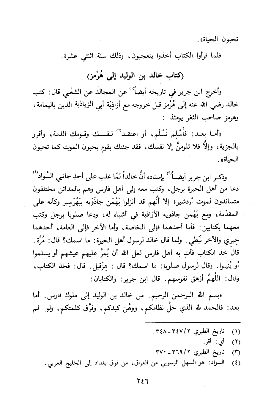 «بسم الله الرحمن الرحيم. من خالد بن الوليد إِلى ملوك فارس. أما بعد: فالحمد لله الذي حلَّ نظامكم، ووهَّن كيدكم، وفرَّق كلمتكم، ولو لم