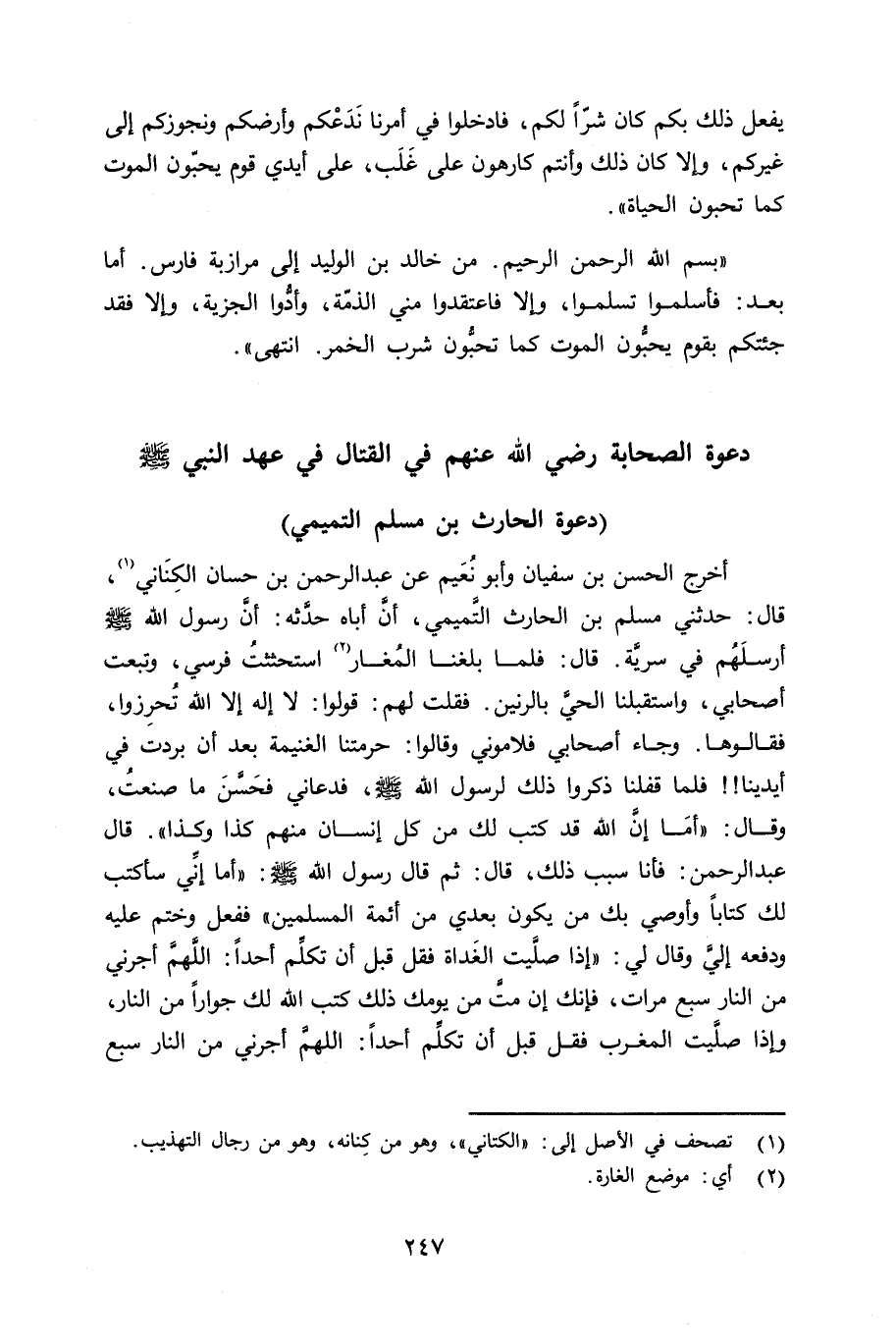 دعوة الصحابة رضي الله عنهم في القتال في عهد النبي صلى الله عليه وسلم دعوة الحارث بن مسلم التميمي