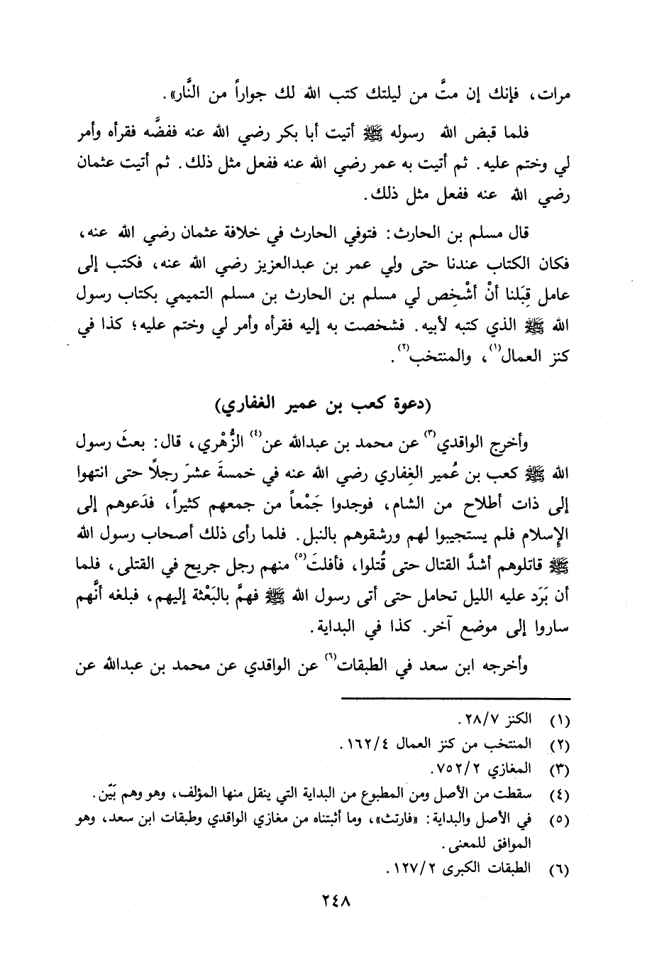 وأخرج الواقدي عن محمد بن عبد الله الزُّهْري قال: بعث رسول الله صلى الله عليه وسلم كعب بن عُمير الغِفاري رضي الله عنه في خمسةَ عشرَ رجلاً حتى انتهوا إلى ذات أطْلاح من الشام، فوجدوا جمعاً من جمعهم كثيراً، فدَعوهم إلى الإِسلام لم يستجيبوا لهم ورشقوهم بالنبل. فلما رأى ذلك أصحاب رسول الله صلى الله عليه وسلم قاتلوهم أشدَّ القتال حتى قُتلوا، فارْتُثَّ منهم رجل جريج في القتلى، فلما أن بَرَد عليه الليل تحامل حتى أتى رسول الله صلى الله عليه وسلم فهمَّ بالبَعْثة إِليهم، فبلغه أنَّهم ساروا إلى موضع آخر. كذا في البداية وأخرجه ابن سعد في الطبقات عن الواقدي عن محمد بن عبد الله عن