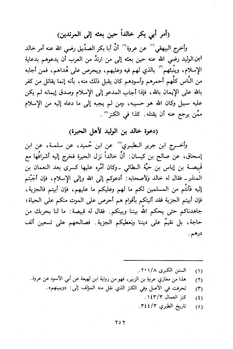 وأخرج ابن جرير الطبري عن ابن حُمَيد، عن سلمة، عن ابن إسحاق، عن صالح بن كيسان: أنَّ خالداً نزل الحيرة فخرج إليه أشرافها مع قبيصة بن إياس بن حيَّة الطائي - وكان أمَّره عليه كسرى بعد النعمان بن المنذر - فقال له خالد ولأصحابه: أدعوكم إِلى الله وإلى الإِسلام، فإن أجبتم إِليه فأنتم من المسلمين لكم ما لهم وعليكم ما عليهم، فإن أبيتم فالجزية، فإن أبيتم فالجزية فقد أتيتكم بأقوام هم أحرص على الموت منكم على الحياة؛ جاهدناكم حتى يحكم الله بيننا وبينكم. فقال له قبيصة: ما لنا بحربك من حاجة، بل نقيم على ديننا ونعطيكم الجزية. فصالحهم على تسعين ألف درهم.