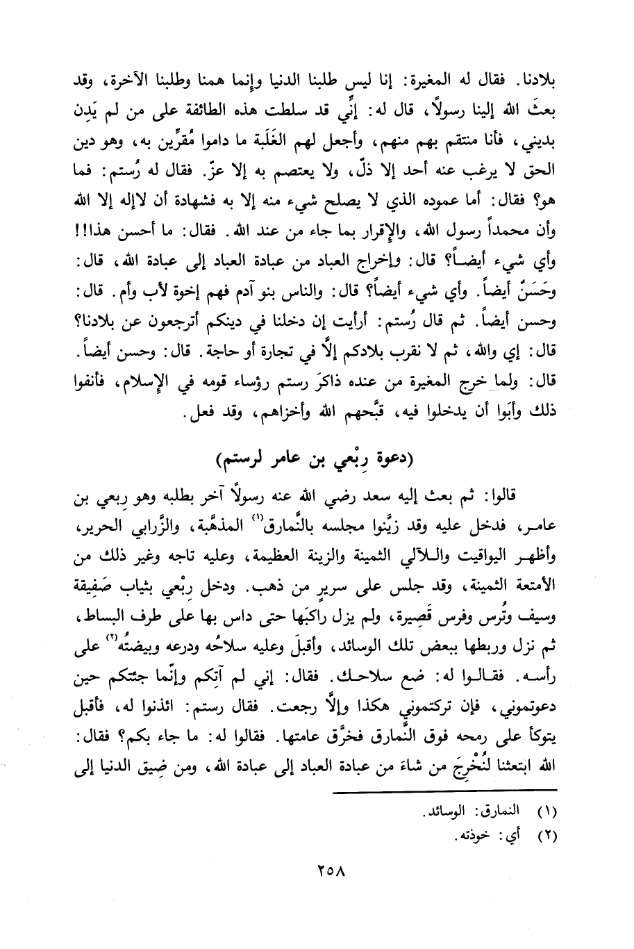 بلادنا. فقال له المغيرة: إنا ليس طلبنا الدنيا وإِنما همنا وطلبنا الآخرة، وقد بعث الله إلينا رسولاً، قال له: إنِّي قد سلطت هذه الطائفة على من لم يَدنِ بديني، فأنا منتقم بهم منهم، وأجعل لهم الغلبة ما داموا مُقرِّين به، وهو دين الحق لا يرغب عنه أحد إلا ذلّ، ولا يعتصم به إلا عزّ. فقال له رُستم: فما هو؟ فقال: أما عموده الذي لا يصلح شيء منه إلا به فشهادة أن لا إله إلا الله وأن محمداً رسول الله، والإِقرار بما جاء من عند الله.