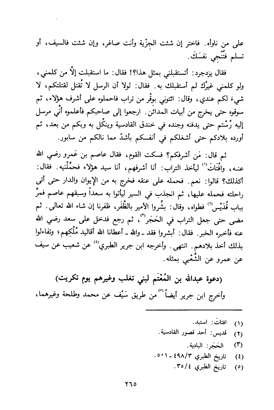ثم قال: ن أشرفكم؟ فسكت القوم، فقال: عاصم بن عمرو رضي الله عنه: وافتات ليأخذ التراب، أنا أشرفهم، أنا سيد هؤلاء فحمِّلْنيه. فقال: أكذلك؟ قالوا: نعم. فحمله على عنقه فخرج به من الإِيوان والدار حتى أتى راحلته فحمله عليها، ثم انجذب في السير ليأتوا به سعداً وسبقهم عاصم فمرَّ بباب قُدَيْس فطواه، وقال: بشِّروا الأمر بالظَّفَر، ظفرنا إن شاء الله تعالى. ثم مضى حتى جعل التراب في الحَجَر، ثم رجع فدخل على سعد رضي الله عنه فأخبره الخبر. فقال: أبشروا فقد - والله - أعطانا الله أقاليد مُلْكِهم؛ وتفاءلوا بذلك أخذ بلادهم. انتهى. وأخرجه ابن جرير، الطبري عن شيب عن سيف عن عمرو عن الشَّعْبي بمثله.