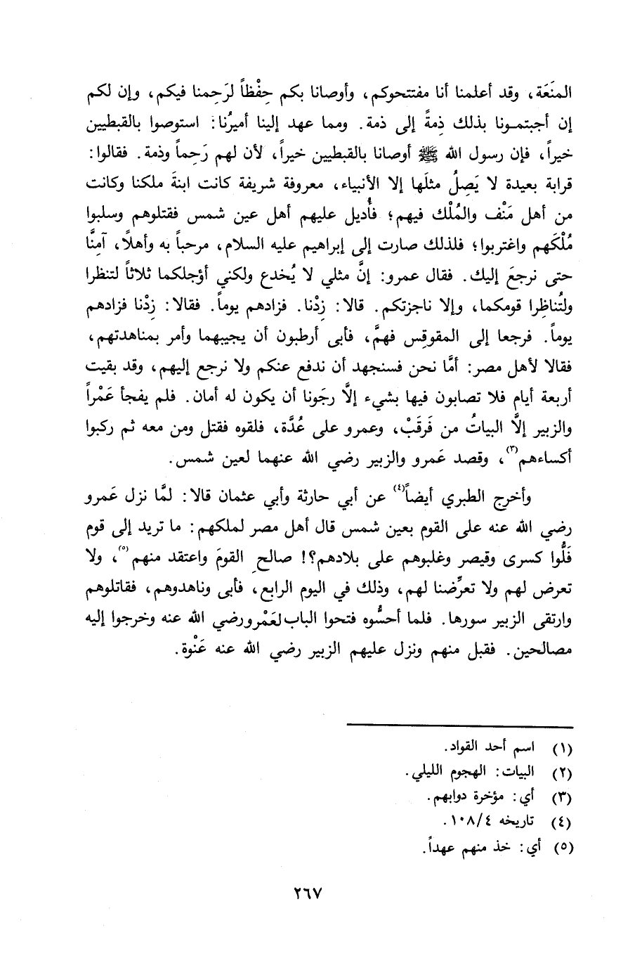 وأخرج الطبري أيضاً عن أبي حارثة، وأبي عثمان قالا: لمَّا نزل عمرو رضي الله عنه على القوم بعين شمس قال أهل مصر لملكهم: ما تريد إلى قوم فَلُّوا كسرى وقيصر وغلبوهم على بلادهم؟ صالحِ القوم واعتقد منهم، ولا تعرض لهم ولا تعرِّضنا لهم، وذلك في اليوم الرابع، فأبى وناهدوهم، فقاتلوهم وارتقى الزبير سورها، فلما أحسُّوه فتحوا الباب لعمرو رضي الله عنه وخرجوا إليه مصالحين. فقبل منهم ونزل عليهم الزبير رضي الله عنه عَنْوة.