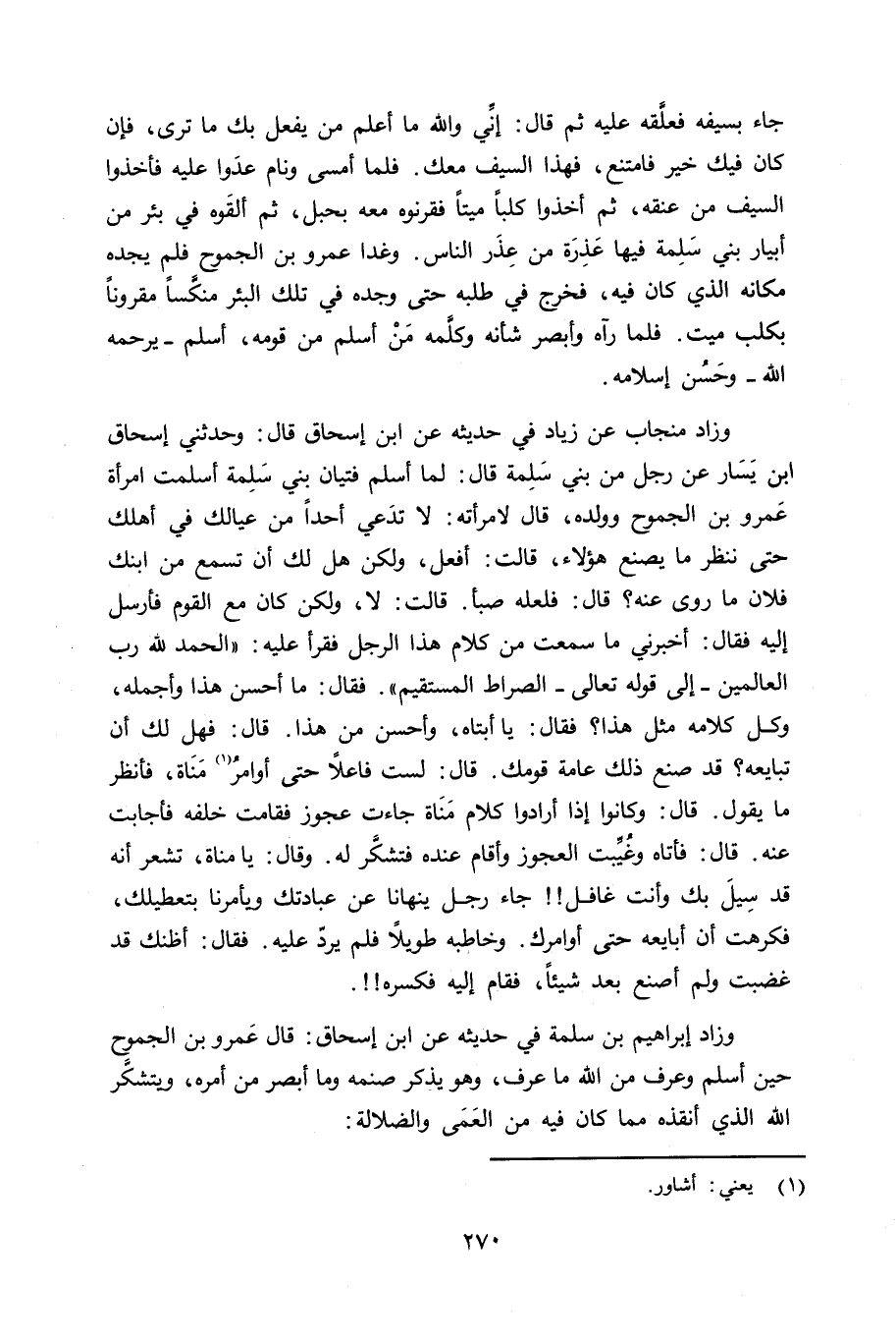 وزاد منجاب عن زياد في حديثه عن ابن إسحاق قال: وحدثني إِسحاق بن يَسَار عن رجل من بني سَلِمة قال: لما أسلم فتيان بني سَلِمة أسلمت إمرأة عمرو بن الجموح وولده، قال لامرأته: لا تدَعي أحداً من عيالك في أهلك حتى ننظر ما يصنع هؤلاء، قالت: أفعل، ولكن هل لك أن تسمع من إبنك فلان ما روى عنه؟ قال: فلعله صبأ. قالت: لا، ولكن كان مع القوم فأرسل إليه فقال: أخبرني ما سمعت من كلام هذا الرجل فقرأ عليه: «الحمد لله رب العالمين - إلى قوله تعالى - الصراط المستقيم» . فقال: ما أحسن هذا وأجمله، كل كلامه مثل هذا؟ فقال: يا أبتاه، وأحسن من هذا. قال: فهل لك أن تبايعه؟ قد صنع ذلك عامة قومك قال: لست فعلاً حتى أوامر مَنَاة، فأنظر ما يقول. قال: وكانوا إِذا أرادوا كلام مَنَاة جاءت عجوز فقامت خلفه فأجابت عنه. قال: فأتاه وغُيِّبت العجوز وأقام عنده فتشكَّر له. وقال: يا مناة، تشعر أنه قد سئل بك وأنت غافل جاء رجل ينهانا عن عبادتك ويأمرنا بتعطيلك، فكرهت أن أبايعه حتى أوامرك. وخاطبه طويلاً فلم يردّ عليه. فقال: أظنك قد غضبت ولم أصنع بعد شيئاً، فقام إليه فكسره.