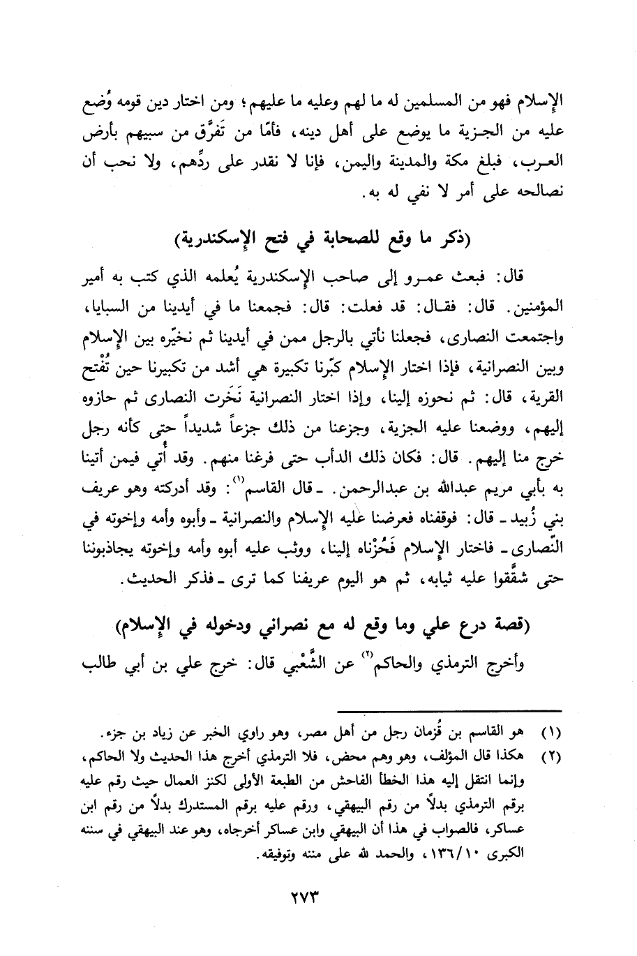 قال: بعث عمرو إلى صاحب الإِسكندرية يُعلمه الذي كتب به أمير المؤمنين. قال: فقال: قد فعلت. قال: فجمعنا ما في أيدينا من السبايا، واجتمعت النصارى، فجعلنا نأتي بالرجل ممن في أيدينا من السبايا، واجتمعت النصارى، فجعلنا نأتي بالرجل ممن في أيدينا ثم نخيّره بين الإِسلام وبين النصرانية، فإذا اختار الإِسلام كبّرنا تكبيرة هي أشد من تكبيرنا حين تفتح القرية. قال: ثم نحوزه إِلينا. وإذا اختار النصرانية نَخَرت النصارى ثم حازوه إليهم، ووضعنا عليه الجزية، وجزعنا من ذلك جزعاً شديداً حتى كأنه رجل خرج منا إليهم. قال: فكان ذلك الدأب حتى فرغنا منهم. وقد أُتي فيمن أتينا به بأبي مريم عبد الله بن عبد الرحمن. - قال القاسم: قد أدركته وهو عريف بني زُبيد - قال: فوقفناه فعرضنا عليه الإِسلام والنصرانية - وأبوه وأمه وإخوته في النّصارى - فاختار الإِسلام فحزْناه إلينا، ووثب عليه أبوه وأمه وإخوته يجاذبوننا حتى شقَّقوا عليه ثيابه، ثم هو اليوم عريفنا كما ترى - فذكر الحديث.