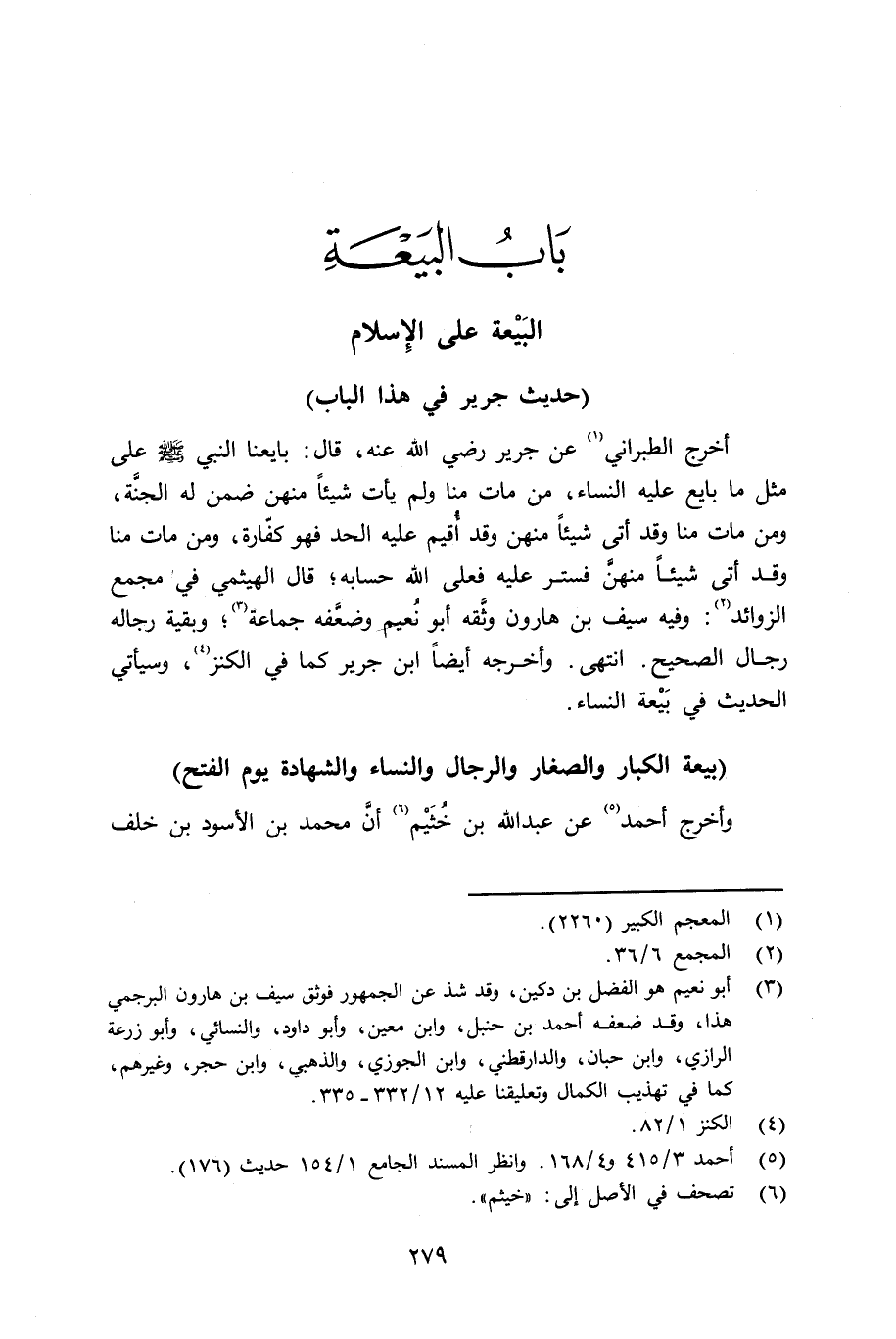 أخرج الطبراين عن جرير رضي الله عنه قال: بايعنا النبي صلى الله عليه وسلم على مثل ما بايع عليه النساء، من مات منا ولم يأت شيئاً منهن ضمن له الجنَّة، ومن مات منا وقد أتى شيئاً منهن وقد أُقيم عليه الحد فهو كفّارة، ومن مات منا وقد أتى شيئاً منهنَّ فستر عليه فعلى الله حسابه؛ قال الهيثمي في مجمع الزوائد وفيه؛ سيف بن هارون وثَّقه وأبو نُعيم وضعَّفه جماعة؛ وبقية رجاله رجال الصحيح. انتهى وأخرجه أيضاً ابن جرير كما في الكنز؛ وسيأتي الحديث في بَيْعة النساء.