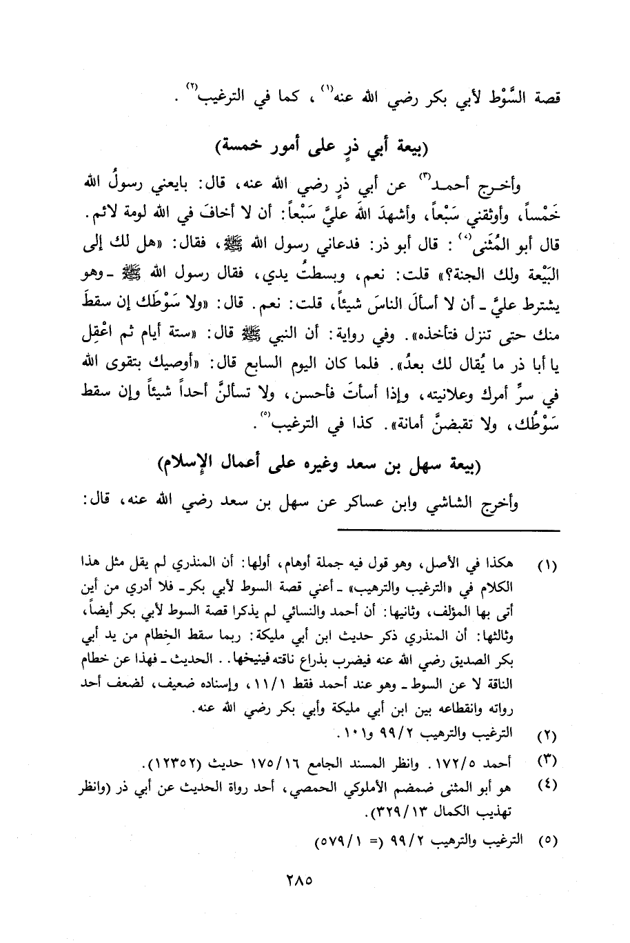 وأخرج أحمد عن أبي ذرِ رضي الله عنه قال: بايعني رسول الله خمساً، وأوثقني سبعاً، وأشهد الله عليَّ سبعاً: أن لا أخاف في الله لومة لائم. قال أبو المُثَنى: قال أبو ذر: فدعاني رسول الله صلى الله عليه وسلم فقال: «هل لك إلى البَيْعة ولك الجنة؟» قلت: نعم، وبسطت يدي، فقال رسول الله صلى الله عليه وسلم ـ وهو يشترط عليَّ - أن لا أسأل الناس شيئاً قلت: نعم. قال: «ولا سوطك إِن سقط منك حتى تنزل فتأخذه» . وفي رواية: أن النبي صلى الله عليه وسلم قال: «ستة أيام ثم أعقل يا أبا ذر ما يقال لك بعد» . فلما كان اليوم السابع قال: «أوصيك بتقوى الله في سرِّ أمرك وعلانيته، وإذا أسأت فأحسن، ولا تسألنَّ أحداً شيئاً وإن سقط سوطك، ولا تقبضنَّ أمانة» . كذا في الترغيب.