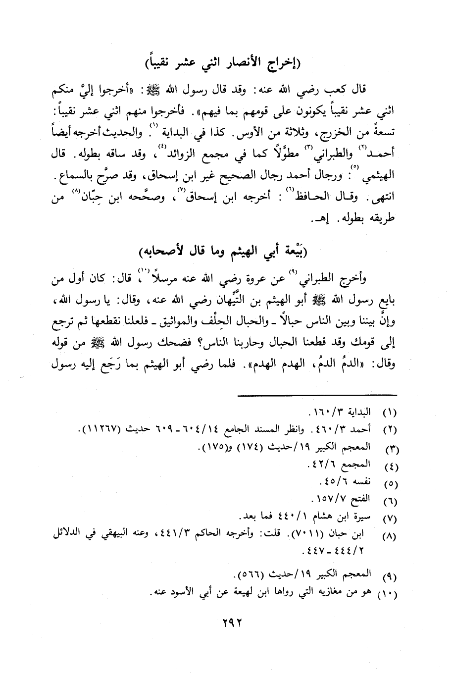 قال كعب رضي الله عنه: وقد قال رسول الله صلى الله عليه وسلم «أخرجوا إليَّ منكم إثني عشر نقيباً يكونون على قومهم بما فيهم» . فأخرجوا منهم إثني عشر نقيباً: تسعة من الخزرج، وثلاثة من الأوس. كذا في البداية. والحديث أخرجه أيضاً أحمد والطبراني مطوَّلاً كما في مجمع الزوائد، وقد ساقه بطوله. قال الهيثمي: ورجال أحمد رجال الصحيح غير ابن إسحاق، وقد صرَّح بالسماع. انتهى. وقال الحافظ: أخرجه ابن إسحاق، وصحَّحه ابن حِبّان من طريقه بطوله اهـ.