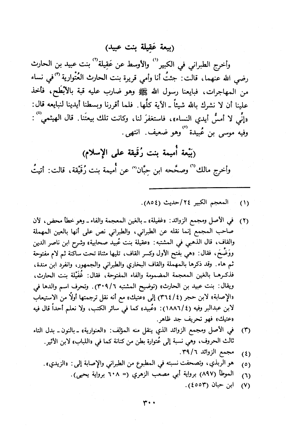 وأخرج الطبراني في الكبير والأوسط عن غفيلة بنت عبيد بن الحارث رضي الله عنهما قالت: جئت أنا وأمي قريرة بنت الحارث العنوارية في نساء من المهاجرات، فبايعنا رسول الله صلى الله عليه وسلم وهو ضارب عليه قبة بالأبْطَح، فأخذ علينا أن لا نشرك بالله شيئاً - الآية كلَّها. فلما أقررنا وبسطنا أيدينا لنبايعه قال: «إنِّي لا أمسُّ أيدي النساء» ، فاستغفر لنا، وكانت تلك بيعتَنا. قال الهيثمي: وفيه: موسى بن عبيدة وهو ضعيف. انتهى.