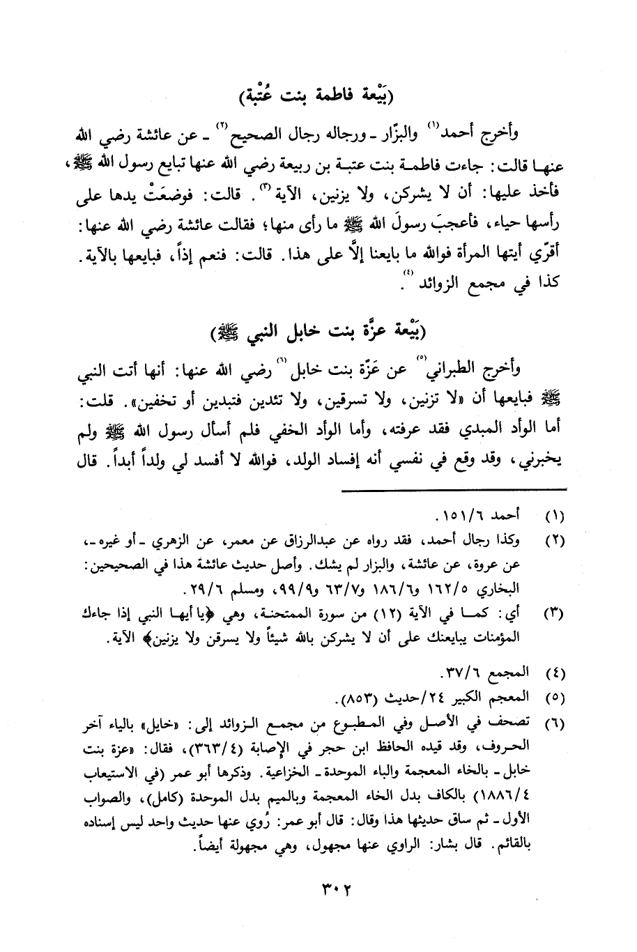 بَيْعة عزَّة بنت خايل النبي صلى الله عليه وسلم وأخرج الطبراني عن عَزّة بنت خايل رضي الله عنها: أنها أتت النبي صلى الله عليه وسلم فبايعها أن «لا تزنين، ولا تسرقين، ولا تئدين فتبدين أو تخفين» . قلت: أما الوأد المبدي فقد عرفته، وأما الوأد الخفي فلم أسأل رسول الله صلى الله عليه وسلم ولم يخبرني، وقد وقع في نفسي أنه إِفساد الولد، فوالله لا أفسد لي ولداً أبداً. قال