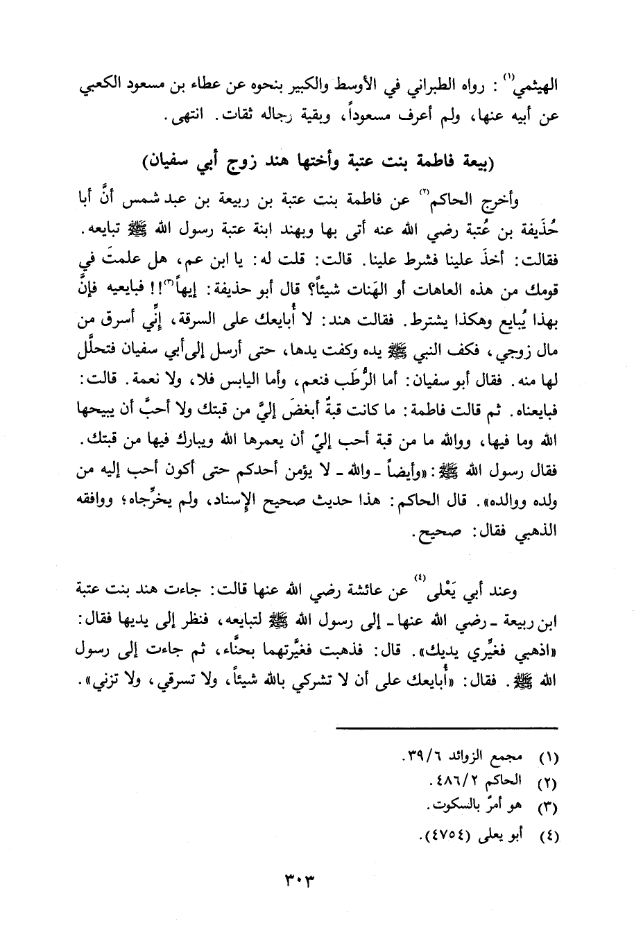 وعند أبي يَعْلى عن عائشة رضي الله عنها قالت: جاءت هند بنت عتبة بن ربيعة - رضي الله عنها - إلى رسول الله صلى الله عليه وسلم لتبايعه، فنظر إلى ييها فقال: «إذهبي فغيِّري يديك» . قال: فذهبت فغيَّرتهما بحنَّاء، ثم جاءت إلى رسول الله صلى الله عليه وسلم فقال: «أُبايعك على أن لا تشركي بالله شيئاً، ولا تسرقي، ولا تزني» .