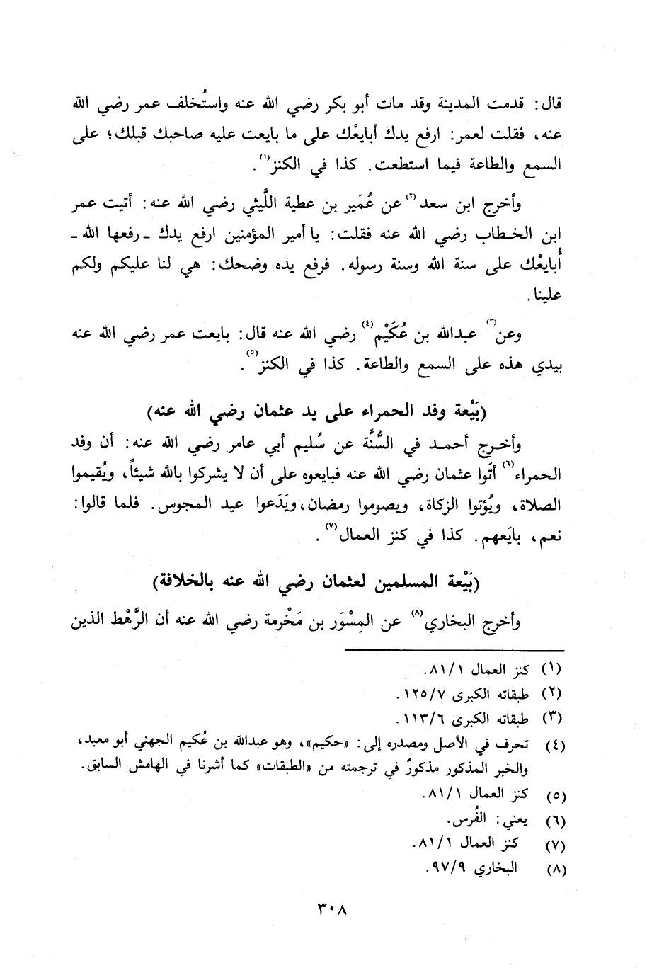 وأخرج ابن سعد عن عُمَير بن عطية اللَّيثي رضي الله عنه: أتيت عمر بن الخطاب رضي الله عنه فقلت: يا أمير المؤمنين إرفع يدك - رفعها الله - أُبايعْك على سنّة الله وسنّة رسوله. فرفع يده وضحك: هي لنا عليكم ولكم علينا. وعن عبد الله بن حكيم رضي الله عنه قال: بايعت عمر رضي الله عنه بيدي هذه على السمع والطاعة. كذا في الكنز.