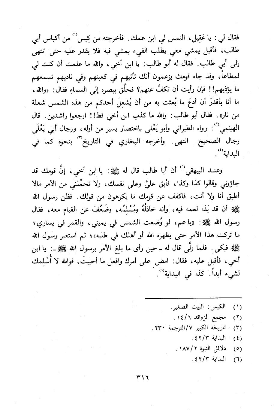 فقال لي: يا عقيل، إلتمس لي ابن عمك. فأخرجته من كِبس من أكباس أبي طالب، فأقبل يمشي معي يطلب الفيء يمشي فيه فلا يقدر عليه حتى انتهى إِلى أبي طالب. فقال له أبو طالب: يا ابن أخي، والله ما علمت أن كنت لي لمطاعاً، وقد جاء قومك يزعمون أنك تأتيهم في كعبتهم وفي ناديهم تسمعهم ما يؤذيهم فإن رأيت أن تكفَّ عنهم؟ فحلَّق ببصره إلى السماءِ فقال: «والله، ما أنا بأقدرَ أن أدعَ ما بُعثت به من أن يُشعِلَ أحدكم من هذه الشمس شعلة من نار» . فقال أبو طالب: والله ما كذب ابن أخي قط إرجعوا راشدين. قال الهيثمي: رواه الطبراني، وأبو يَعْلَى باختصار يسير من أوله، ورجال أبي يَعْلَى رجال الصحيح. إنتهى. وأخرجه البخاري في التاريخ بنحوه كما في البداية.