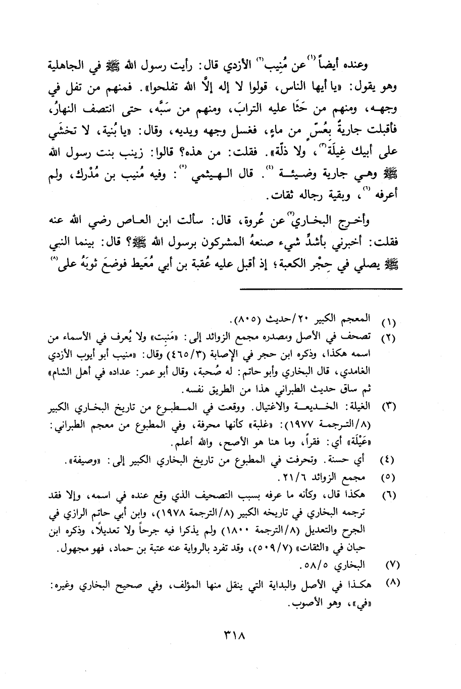وعنده أيضاً عن مَنبِت الأزدي قل: رأيت رسول الله صلى الله عليه وسلم في الجاهلية وهو يقول: «يا أيها الناس، قولوا لا إله إلا الله تفلحوا» فمنهم من تفل في وجهه، ومنهم من حثا عليه التراث، ومنهم من سبَّه، حتى انتصف النهار، فأقبلت جارية بِعُسّ من ماء، فغسل وجهه ويديه وقال: «يا بنية، لا تخشيَ على أبيك غِيلَة، ولا ذلّة» . فقلت: من هذه؟ قالوا: زينب بنت رسول الله صلى الله عليه وسلم وهي جارية وضيئة. قال الهيثمي: وفيه مَنبِت بن مُدْرك، ولم أعرفه، وبقية رجاله ثقات.
