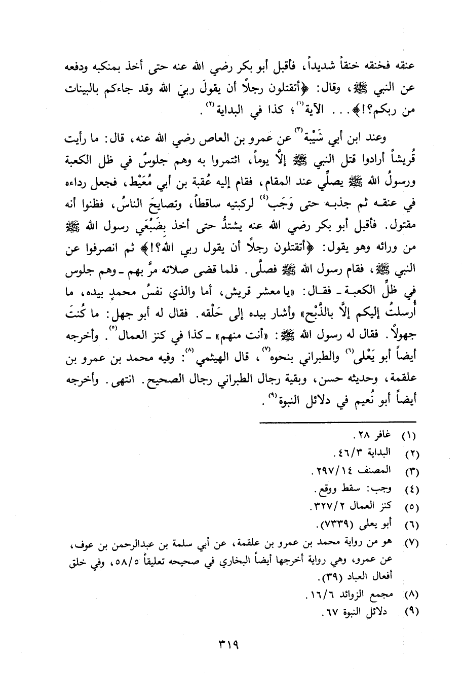 وعند ابن أبي شَيْبة عن عمرو بن العاص رضي الله عنه قال: ما رأيت قريشاً أرادوا قتل النبي صلى الله عليه وسلم إلا يوماً ائتمروا به وهم جلوس في ظل الكعبة ورسول الله صلى الله عليه وسلم يصلِّي عند المقام، فقام إليه عقبة بن أبي مُعَط، فجعل رداءه في عنقه ثم جذبه حتى وجب لركبتيه ساقطاً، وتصايح الناس، فظنوا أنه مقتول. فأقبل أبو بكر رضي الله عنه يشتد حتى أخذ بِضَبُعَي رسول الله صلى الله عليه وسلم من ورائه ويقول: «أتقتلون رجلاً أن يقول ربي الله؟» ثم انصرفوا عن النبي صلى الله عليه وسلم فقام رسول الله صلى الله عليه وسلم فصلّى فلما قضى صلاته مرَّ بهم - وهم جلوس في ظلِّ الكعبة - فقال: يا معشر قريش، أما والذي نفس محمد بيده، ما أرسلت إليك إلا بالذبح» وأشار بيده إلى حَلْقه. فقال له أبو جهل: ما كنت جهولاً. فقال له رسول الله صلى الله عليه وسلم «أنت منهم» - كذا في كنز العمال. وأخرجه أيضاً أبو يَعْلى والطبراني بنحوه، قال الهيثمي: وفيه محمد بن عمرو بن علقمة، وحديثه حسن، وبقية رجال الطبراني رجال الصحيح. انتهى. وأخرجه أيضاً أبو نُعيم في دلائل النبوة (ص 67) .