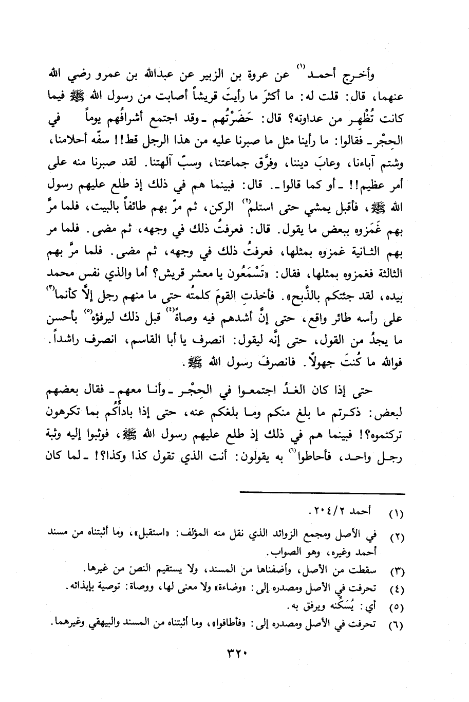 وأخرج أحمد عن عروة بن الزبير عن عبد الله بن عمرو رضي الله عنهما قال: قلت له: ما أكثرَ ما رأيتَ قريشاً أصبت من رسول الله صلى الله عليه وسلم فيما كانت تظهر من عداوته؟ قال: حضرتهم - وقد اجتمع أشرافهم في الحِجْر - فقالوا: ما رأينا مثل ما صبرنا عليه من هذا الرجل قط سفّه أحلامنا، وشتم آباءنا، وعاب ديننا، وفرَّق جماعتنا، وسبّ آلهتنا. لقد صبرنا منه على أمر عظيم - أو كما قالوا -. قال: فبينما هم في ذلك إذ طلع عليهم رسول الله صلى الله عليه وسلم فأقبل يمشي حتى استقبل الركن، ثم مرّ بهم طائفاً بالبيت. فلما مرَّ بهم غمزوه ببعض ما يقول. قال: فعرفت ذلك في وجهه، ثم مضى. فلما مر بهم الثانية غمزوه بمثلها، فعرفت ذلك في وجهه، ثم مضى. فل مرَّ بهم الثالثة فغمزوه بمثلها، فقال: «أتسمعون يا معشر قريش؟ أما والذي نفس محمد بيده، لقد جئتكم بالذَّبح» . فأخذتِ القومَ كلمتُه حتى ما منهم رجل إلا على رأسه طائر واقع، حتى إنَّ أشدهم فيه وضاءة قبل ذلك ليرفؤه بأحسن ما يجد من القول، حتى إنَّه ليقول: إنصرف يا أبا القاسم، إنصرف راشداً. فوالله ما كنت جهولاً. فانصرف رسول الله صلى الله عليه وسلم