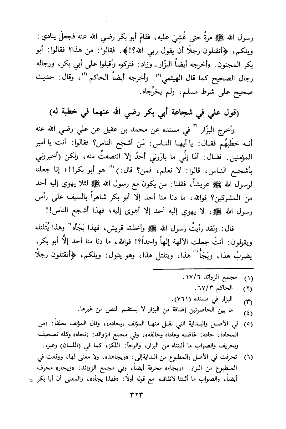 وأخرج البزّار في مسنده عن محمد بن عقيل عن علي رضي الله عنه أنه خطبهم فقال: يا أيها الناس: من أشجع الناس؟ فقالوا: أنت يا أمير المؤمنين. فقال: أمَا إنِّي ما بارزني أحد إلا انتصفتُ منه، ولكن هو أبو بكر؛ إنا جعلنا لرسول الله صلى الله عليه وسلم عريشاً، فقلنا: من يكون مع رسول الله صلى الله عليه وسلم لئلا يهوي إليه أحد من المشركين؟ فوالله، ما دنا منا أحد إلا أبو بكر شاهراً بالسيف على رأس رسول الله صلى الله عليه وسلم لا يهوي إليه أحد إلا أهوى إليه؛ فهذا أشجع الناس.