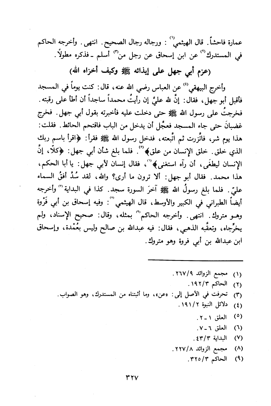وأخرج البيهقي عن العباس رضي الله عنه قال: كنت يوماً في المسجد فأقبل أبو جهل، فقال: إِنَّ لله عليَّ إن رأيت محمداً ساجداً أن أطأ على رقبته، فخرجت على رسول الله صلى الله عليه وسلم حتى دخلت عليه فأخبرته بقول أبي جهل. فخرج غضبانَ حتى جاء المسجد فعجَّل أن يدخل من الباب فاقتحم الحائط. فقلت: هذا يوم شر، فاتَّزرت ثم اتَّبعته، فدخل رسول الله صلى الله عليه وسلم فقرأ: {اقْرَأْ بِاسْمِ رَبّكَ الَّذِى خَلَقَ خَلَقَ الإِنسَانَ مِنْ عَلَقٍ} (العلق: 1، 2) . فلما بلغ شأن أبي جهل: {كَلاَّ إِنَّ الإِنسَانَ لَيَطْغَى أَن رَّءاهُ اسْتَغْنَى} (العلق: 6، 7) ، فقال إنسان لأبي جهل: يا أبا الحكم، هذا محمد. فقال أبو جهل: ألا ترون ما أرى؟ والله، لقد سُدَّ أفقُ السماء عليّ. فلما بلغ رسول الله صلى الله عليه وسلم آخر السورة سجد. كذا في البداية وأخرجه أيضاً الطبراني في الكبير والأوسط، قال الهيثمي وفيه: إِسحاق بن أُبي فَرْوة وهو متروك. انتهى؛ وأخرجه الحاكم بمثله، وقال: صحيح الإِسناد، ولم يخرِّجاه، وتعقَّبه الذهبي، فقال: فيه عبد الله بن صالح وليس بعُمْدة، وإسحاق بن عبد الله بن أبي فروة وهو متروك.