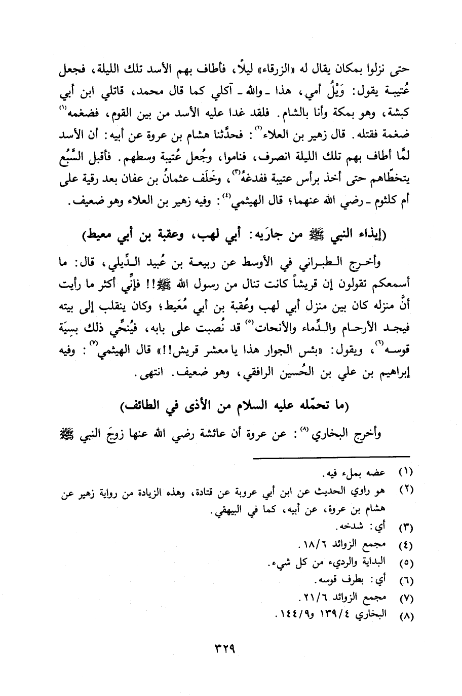 وأخرج الطبراني في الأوسط عن ربيعة بن عُبيد الدِيلي قال: ما أسمعكم تقولون إن قريشاً كانت تنال من رسول الله صلى الله عليه وسلم فإنِّي أكثر ما رأيت أنَّ منزله كان بين منزل أبي لهب وعُقبة بن أبي مُعَيط؛ وكان ينقلب إلى بيته فيجد الأرحام والدِّماء والأنحات قد نصبت على بابه، فيُنحِّي ذلك بسِيَة قوسه، ويقول: «بئس الجوار هذا يا معشر قريش» قال الهيثمي: وفيه إبراهيم بن علي بن الحسين الرافقي، وهو ضعيف. انتهى.