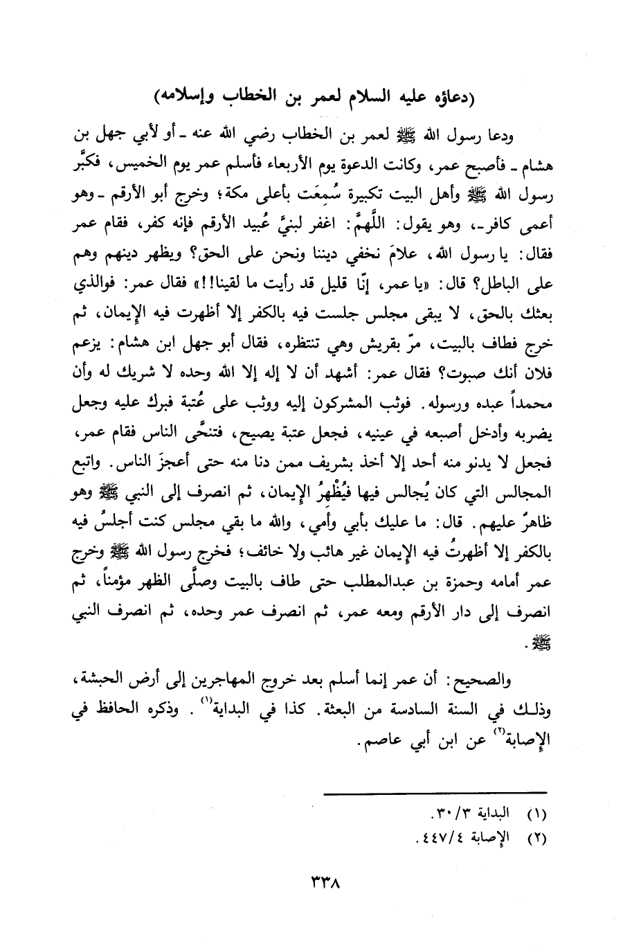 ودعا رسول الله لعمر بن الخطاب رضي الله عنه - أو لأبي جهل بن هشام - فأصبح عمر، وكانت الدعوة يوم الأربعاء فأسلم مر يوم الخميس، فكبَّر رسول الله صلى الله عليه وسلم وأهل البيت تكبيرة سمعت بأعلى مكة؛ وخرج أبو الأرقم - وهو أعمى كافر -، وهو يقول: اللَّهمَّ: إغفر لبنيَّ عبيد الأرقم فإنه كفر، فقام عمر فقال: يا رسول الله، علامَ نخفي ديننا ونحن على الحق؟ ويظهر دينهم وهم على الباطل؟ قال: «يا عمر، إنّا قليل قد رأيت ما لقينا» فقال عمر: فوالذي بعثك بالحق، لا يبقى مجلس جلس فيه بالكفر إِلا أظهرت فيه الإِيمان، ثم خرج فطاف بالبيت، مرّ بقريش وهي تنتظره، فقال أبو جهل بن هشام: يزعم فلان أنك صبوت؟ فقال عمر: أشهد أن لا إله إلا الله وحده لا شريك له وأن محمداً عبده ورسوله. فوثب المشركون إليه ووثب على عتبة فبرك عليه وجعل يضربه وأدخل أصبعه في عينيه، فجعل عتبة يصيح، فتنحَّى الناس فقام عمر، فجعل لا يدنو منه أحد إلا أخذ بشريف ممن دنا منه حتى أعجز الناس. واتبع المجالس التي كان يُجالس فيها فيظهر الإِيمان، ثم انصرف إلى النبي صلى الله عليه وسلم وهو ظاهر عليهم. قال: ما عليك بأبي وأمي، والله ما بقي مجلس كنت أجلس فيه بالكفر إلا أظهرت فيه الإِيمان غير هائب ولا خائف؛ فخرج رسول الله صلى الله عليه وسلم وخرج عمر أمامه وحمزة بن عبد المطلب حتى طاف بالبيت وصلَّى الظهر مؤمناً، ثم انصرف إلى دار الأرقم ومعه عمر، ثم انصرف عمر وحده، ثم نصرف النبي صلى الله عليه وسلم