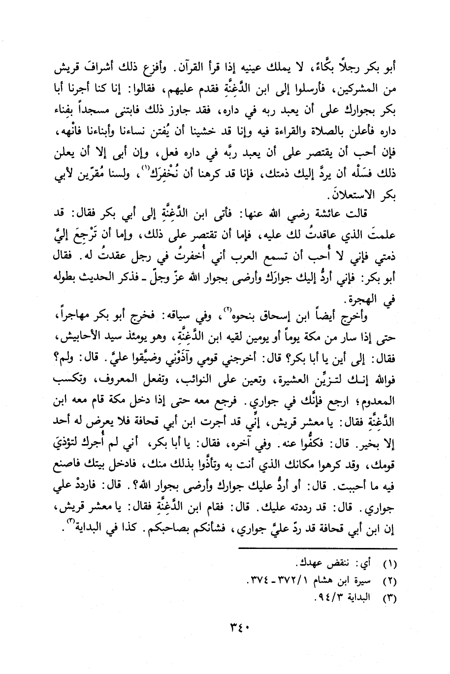وأخرج أيضاً ابن إسحاق بنحوه، وفي سياقه: فخرج أبو بكر مهاجراً، حتى إِذا سار من مكة يوماً أو يومين لقيه ابن الدُّغُنَّة - وهو يومئذٍ سيد الأحابيش -، فقال: إِلى أين يا أبا بكر؟ قال: أخرجني قومي وآذَوْني وضيَّقوا عليَّ. قال: ولم؟ فوالله إنك لتزيِّن العشيرة، وتعين على النوائب، وتفعل المعروف، وتكسب المعدوم؛ إرجع إنَّك في جواري. فرجع معه حتى إذ دخل مكة قام معه ابن الدُّغُنَّة فقال: يا معشر قريش. إنِّي قد أجرت ابن أبي قحفة فلا يُعرض له أحد إلا بخير. قال: فكفُّوا عنه، وفي آخره فقال: يا أبا بكر، إِني لم أُجرك لتؤذيَ قومك، وقد كرهوا مكانك الذي أنت به وتأذَّوا بذلك منك، فأدخل بيتك فصنع فيها أحببت. قال: أو أردُّ عليك جوارك وأرضى بجوار الله؟. قال: فارددْ عليّ جواري. قال: قد رددته عليك. قال: فقام ابن الدُّغُنَّة فقال: يا معشر قريش، إن ابن أبي قحافة قد ردّ عليَّ جواري، فشأنكم بصاحبك، كذا في البداية.