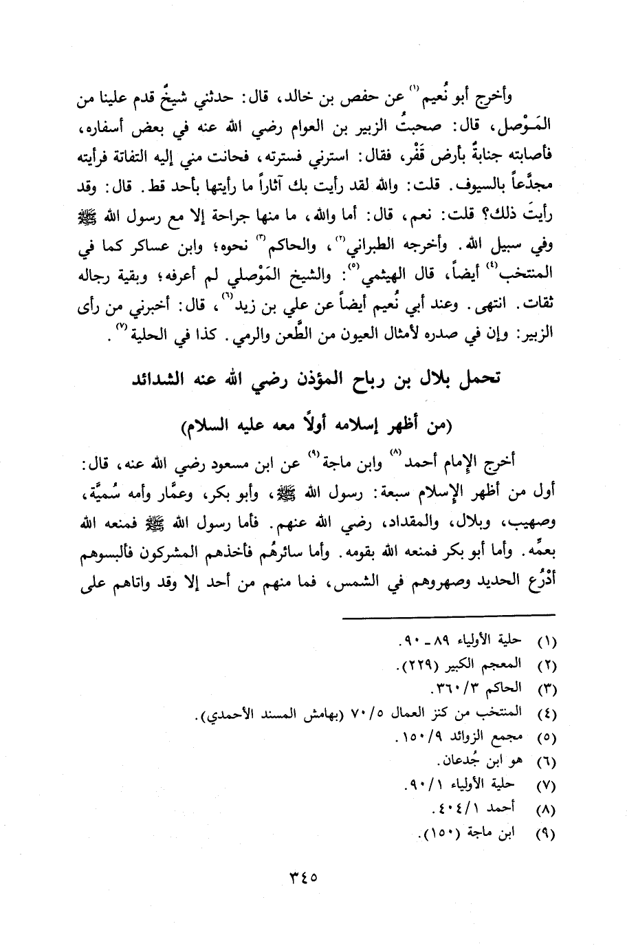 وأخرج أبو نُعيم عن حفص بن خالد قال: حدثني شيخ قدم علينا من المَوْصل قال: صحبت الزبير بن العوام رضي الله عنه في بعض أسفاره، فأصابته جنابة بأرض قفر، فقال: إسترني فسترته، فحانت مني إليه التفاتة فرأيته مجدَّعاً بالسيوف. قلت: والله لقد رأيت بك آثاراً ما رأيتها بأحد قط. قال: وقد رأيت ذلك؟ قلت: نعم، قال: أما والله، ما منها جراحة إلا مع رسول الله صلى الله عليه وسلم وفي سبيل الله. وأخرجه الطبراني، والحاكم نحوه ابن عساكر كما في المنتخب أيضاً. قال الهيثمي والشيخ المَوْصلي لم أعرفه؛ وبقية رجاله ثقات. انتهى، وعند أبي نُعيم أيضاً عن علي بن زيد قال: أخبرني من رأى الزبير: وإن في صدره لأمثال العيون من الطَّعن والرمي. كذا في الحلية.