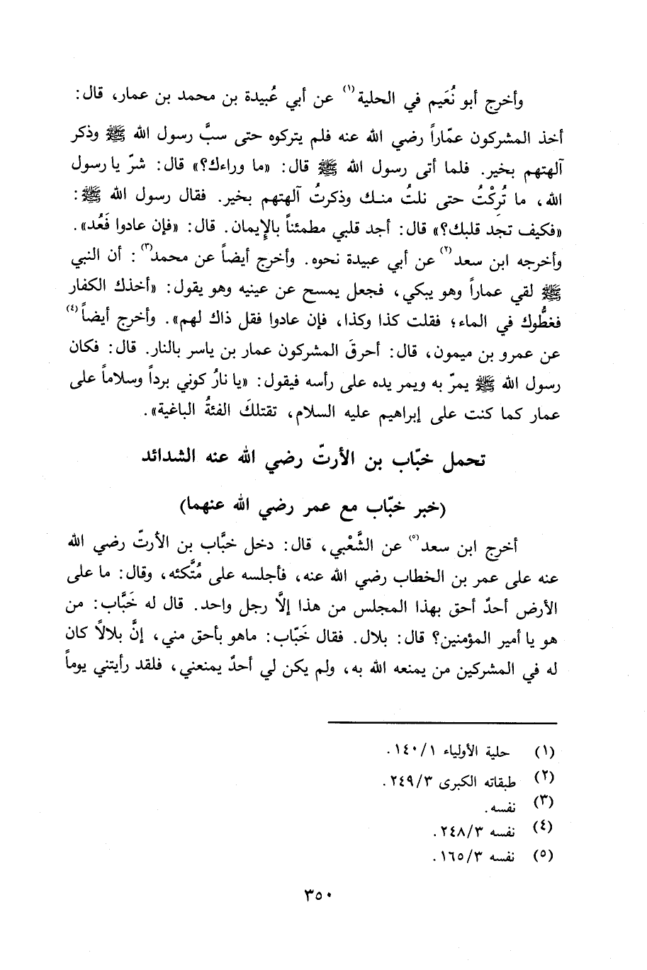 وأخرج أبو نُعَيم في الحلية عن أبي عبيدة بن محمد بن عمار قال: أخذ المشركون عمّاراً رضي الله عنه فلم يتركوه حتى سبَّ رسول الله صلى الله عليه وسلم وذكر آلهتهم بخير. فلما أتى رسول الله صلى الله عليه وسلم قال: «ما وراءك؟» قال: شرّ يا رسول الله، ما تركت حتى نلتُ منك وذكرت آلهتهم بخير. فقال رسول الله صلى الله عليه وسلم «فكيف تجد قلبك؟» قال: أجد قلبي مطمئناً بالإِيمان. قال: «فإن عادا فَعُد» . وأخرجه ابن سعد عن أبي عبيدة نحوه. وأخرج أيضاً عن محمد: أن النبي صلى الله عليه وسلم لقي عماراً وهو يبكي، فجعل يمسح عن عينيه وهو يقول: «أخذك الكفار فغطُّوك في الماء؛ فقلت كذا وكذا، فإن عادوا فقل ذاك لهم» . وأخرج أيضاً عن عمرو بن ميمون قال: أحرق المشركون عمار بن ياسر بالنار. قال فكان رسول الله صلى الله عليه وسلم يمرّ به ويمر يده على رأسه فيقول: «يا نارُ كوني برداً وسلاماً على عمار كما كنت على إبراهيم عليه السلام، تقتلك الفئة الباغية» .