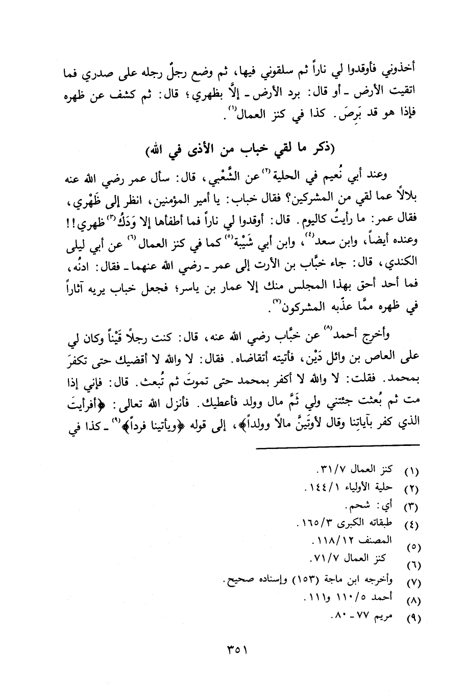 وعند أبي نُعيم في الحلية عن الشَّعْبي قال: سأل عمر رضي الله عنه بلالاً عما لقي من المشركين؟ فقال: خباب: يا أمير المؤمنين، أنظر إلى ظهري، فقال عمر: ما رأيت كاليوم. قال: أوقدوا لي ناراً فما أطفأها إلا وَدَكُ ظهري وعنده أيضاً، وابن سعد، وابن أبي شَيْبة كما في كنز العمال عن أبي ليلى الكندي قال: جاء خبَّاب بن الأرت إِلى عمر - رضي الله عنهما - فقال: أدنُه، فلما أحد أحق بهذا المجلس منك إلا عمار بن ياسر؛ فجعل خباب يريه آثاراً في ظهره ممَّا عذّبه المشركون.