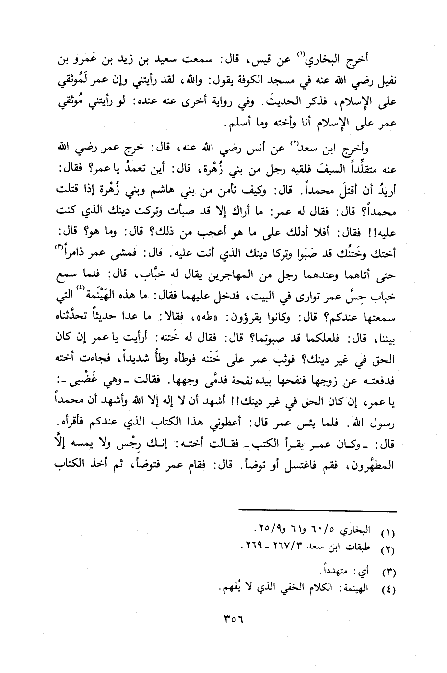 وأخرج ابن سعد عن أنس رضي الله عنه قال: خرج عمر رضي الله عنه متقلداً السيف فلقيه رجل من بني زُهْرة قال: أين تعمد يا عمر؟ فقال: أريد أن أقتل محمداً. فقال: وكيف تأمن من بني هاشم وبني زُهْرة إذا قتلت محمداً؟ قال: فقال له عمر: ما أراك إلا قد صبأت وتركت دينك الذي كنت عليه فقال أفلا أدلك على ما هو أعجب من ذلك؟ قال: وما هو؟ قال: أختك وخَتنُك قد صَبَوا وتركا دينك الذي أنت عليه. قال: فمشى عمر ذامراً حتى أتاهما وعندما رجل من المهاجرين يقال له خبَّاب قال: فلما سمع خباب حِسَّ عمر توارى في لبيت، فدخل عليهما فقال: ما هذه الهَيْنَمة التي سمعتها عندكم؟ قال: وكانوا يقرؤون: «طه» ، فقالا: ما عدا حديثاً تحدَّثناه بيننا، قال: فلعلكما قد صبوتما قال: فقال له ختنة: أرأيت يا عمر إن كان الحق في غير دينك؟ فوثب عمر على خَتَنة فوطأه وطأً شديداً، فجاءت أخته فدفعته عن زوجها فنفحها بيده نفحة فدمَّى وجهها. فقالت - وهي غضبَى -: يا عمر، إن كان الحق في غير دينك أشهد أن لا إله إلا الله وأشهد أن محمداً رسول الله صلى الله عليه وسلم فلما يئس عمر قال: أعطوني هذا الكتاب الذي عندكم فأقرأه. قال: - وكان عمر يقرأ الكتب - فقالت أخته؛ إنك رِجْس ولا يمسه إلا المطهَّرون، فقم فاغتسل أو توضأ. قال: قام عمر فتوضأ، ثم أخذ الكتاب