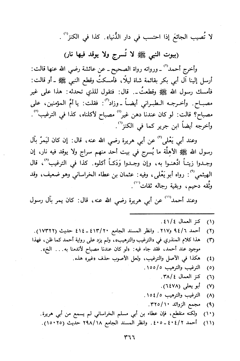 وأخرج أحمد - ورواته رواة الصحيح - عن عائشة رضي الله عنها قالت: أرسل إلينا آل أبي بكر بقائمة شاة ليلاً، فأمسكتُ وقطع النبي صلى الله عليه وسلم ـ أو قالت: فأمسك رسول الله صلى الله عليه وسلم وقطعتُ -. قال: فتقول للذي تحدثه هذا على غير مصباح. وأخرجه الطبراني أيضاً - وزاد: فقلت: يا أمَّ المؤمنين، على مصباح؟ قالت: لو كان عندنا دهن غير مصباح لأكلناه - كذا في الترغيب. قال الهيثمي: رواه أبو يَعْلى، وفيه: عثمان بن عطاء الخراساني وهو ضعيف، وقد وثَّقه دحيم، وبقية رجاله ثقات.