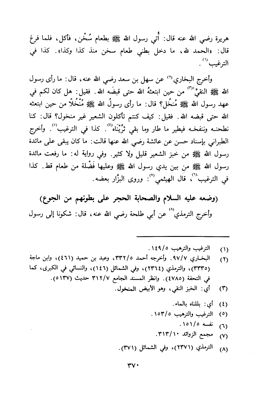 هريرة رضي الله عنه قال: أُتي رسول الله صلى الله عليه وسلم بطعام سُخْن، فأكل. فلما فرغ قال: «الحمد لله؛ ما دخل بطني طعام سخن منذ كذا وكذا» . كذا في الترغيب.