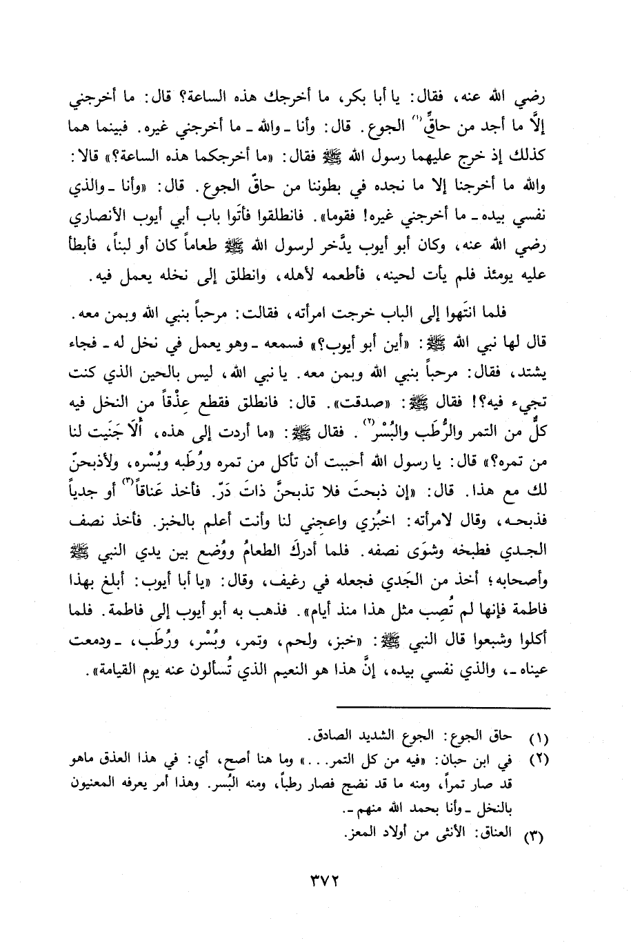 فلما انتَهوا إلى الباب خرجت إمرأته فقالت: مرحباً بنبي الله وبمن معه. قال لها نبي الله صلى الله عليه وسلم «أين أبو أيوب؟» فسمعه - وهو يعلم في نخل له - فجاء يشتد فقال: «مرحباً بنبي الله وبمن معه. يا نبي الله، ليس بالحين الذي كنت تجيء فيه؟ فقال صلى الله عليه وسلم «صدقت» . قال: فانطلق فقطع عِذْقاً من النخل فيه كلٌّ من التمر والرُّطَب والبُسْر. فقال صلى الله عليه وسلم «ما أردت إلى هذه، ألا جَنَيت لنا من تمره؟» قال: يا رسول الله أحببت أن تأكل من تمره وخطَبه وبُسْره، ولأذبحنّ لك مع هذا. قال: «إن ذبحتَ فلا تذبحنَّ ذاتَ دَرّ» . فأخذ عَناقاً أو جدياً فذبحه، وقال لامرأته: أخبُزي واعجِني لنا وأنت أعلم بالخبز. فأخذ نصف الجدي فطبخه وشوَى نصفه. فلما أدرك الطعام ووُضع بين يدي النبي صلى الله عليه وسلم وأصحابه؛ أخذ من الجَدي فجعله في رغيف وقال: «يا أبا أيوب: أبلغ بهذا فاطمة فإنها لم تُصِب مثل هذا منذ أيام» . فذهب أبو أيوب إلى فاطمة. فلما أكلوا وشبعوا قال النبي صلى الله عليه وسلم «خبز، ولحم، وتمر، وبُسْر، ورُطَب، - ودمعت عيناه -، والذي نفسي بيده، إنَّ هذا هو النعيم الذي تسألون عنه يوم القيامة» .