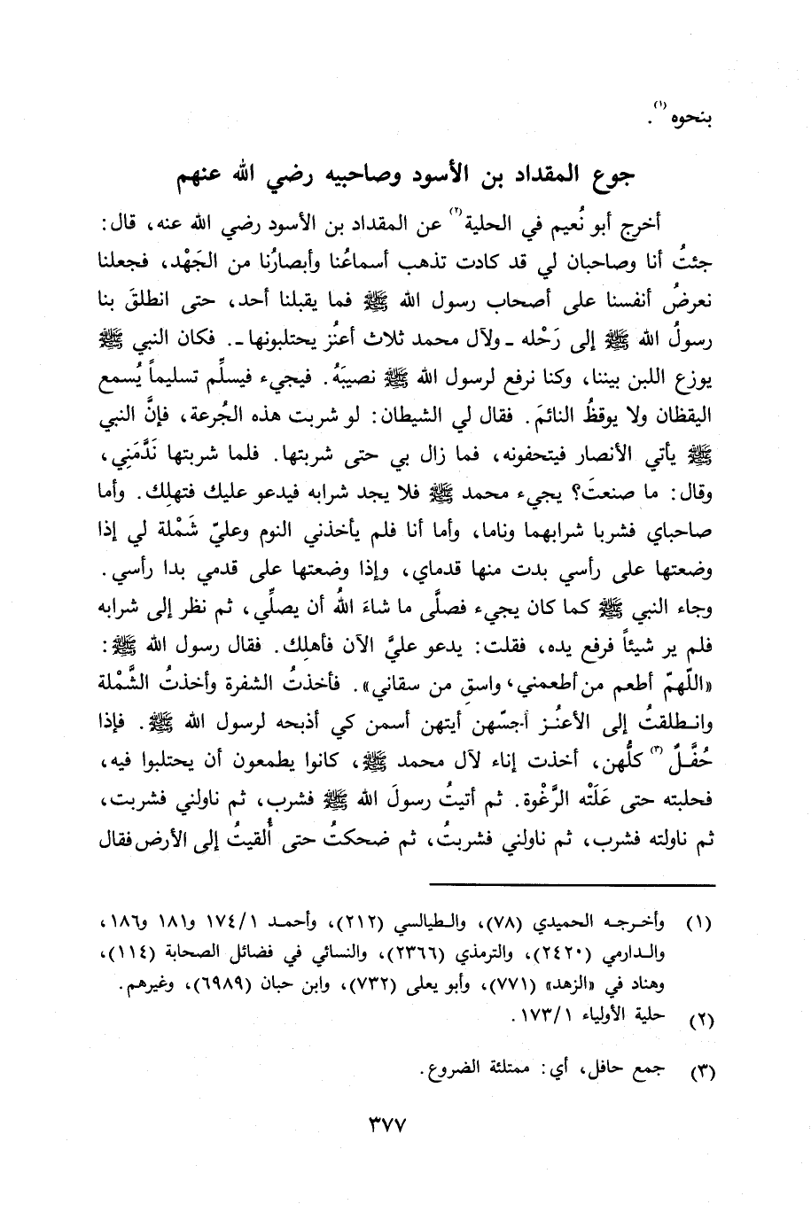 أخرج أبو نعيم في الحلية عن المقداد بن الأسود رضي الله عنه قال: جئت أنا وصاحبان لي قد كادت تذهب أسماعنا وأبصارنا من الجَهْد، فجعلنا نعرض أنفسنا على أصحاب رسول الله صلى الله عليه وسلم فما يقبلنا أحد، حتى انطلق بنا رسول الله صلى الله عليه وسلم إلى رَحْله - ولآل محمد ثلاث أعنُز يحتلبونها -. فكان النبي صلى الله عليه وسلم يوزع اللبن بيننا، وكنا نرفع لرسول الله صلى الله عليه وسلم نصيبه. فيجيء فيسلِّم تسليماً يُسمع اليقظان ولا يوقظ النائم. فقال لي الشيطان: لو شربت هذه الجُرعة، فإنَّ النبي صلى الله عليه وسلم يأتي الأنصار فيتحفونه، فما زال بي حتى شربتها. فلما شربتها ندّمني وقال: ما صنعت يجيء محمد صلى الله عليه وسلم فلا يجد شرابه فيدعو عليك فتهلِك. وأما صاحباي فشربا شرابهما وناما، وأما أنا فلم يأخذني النوم وعليّ شَمْلة لي إذا وضعتها على رأسي بدت منها قدماي، وإِذا وضعتها على قدمي بدا رأسي. وجاء النبي صلى الله عليه وسلم كما كان يجيء فصلَّى ما شاء الله أن يصلِّي، ثم نظر إلى شرابه فلم يرَ شيئاً فرفع يده، فقلت: يدعو عليَّ الآن فأهلِك. فقال رسول الله صلى الله عليه وسلم «اللَّهمّ أطعم من أطعمني، واسقِ من سقاني» . فأخذت الشفرة وأخذت الشَّمْلة وانطلقت إلى الأعنْز أجسّهن أيتهن أسمن كي أذبحه لرسول الله صلى الله عليه وسلم فإذا حُفَّل كلُّهن أخذت إناء لآل محمد صلى الله عليه وسلم كانوا يطمعون أن يجتلبوا فيه، فحلبته حتى عَلَتْه الرَّغْوة. ثم أتيت رسول الله صلى الله عليه وسلم فشرب، ثم ناولني فشربت، ثم ناولته فشرب، ثم ناولني فشربت، ثم ضحكت حتى أُلقيت إلى الأرض. فقال