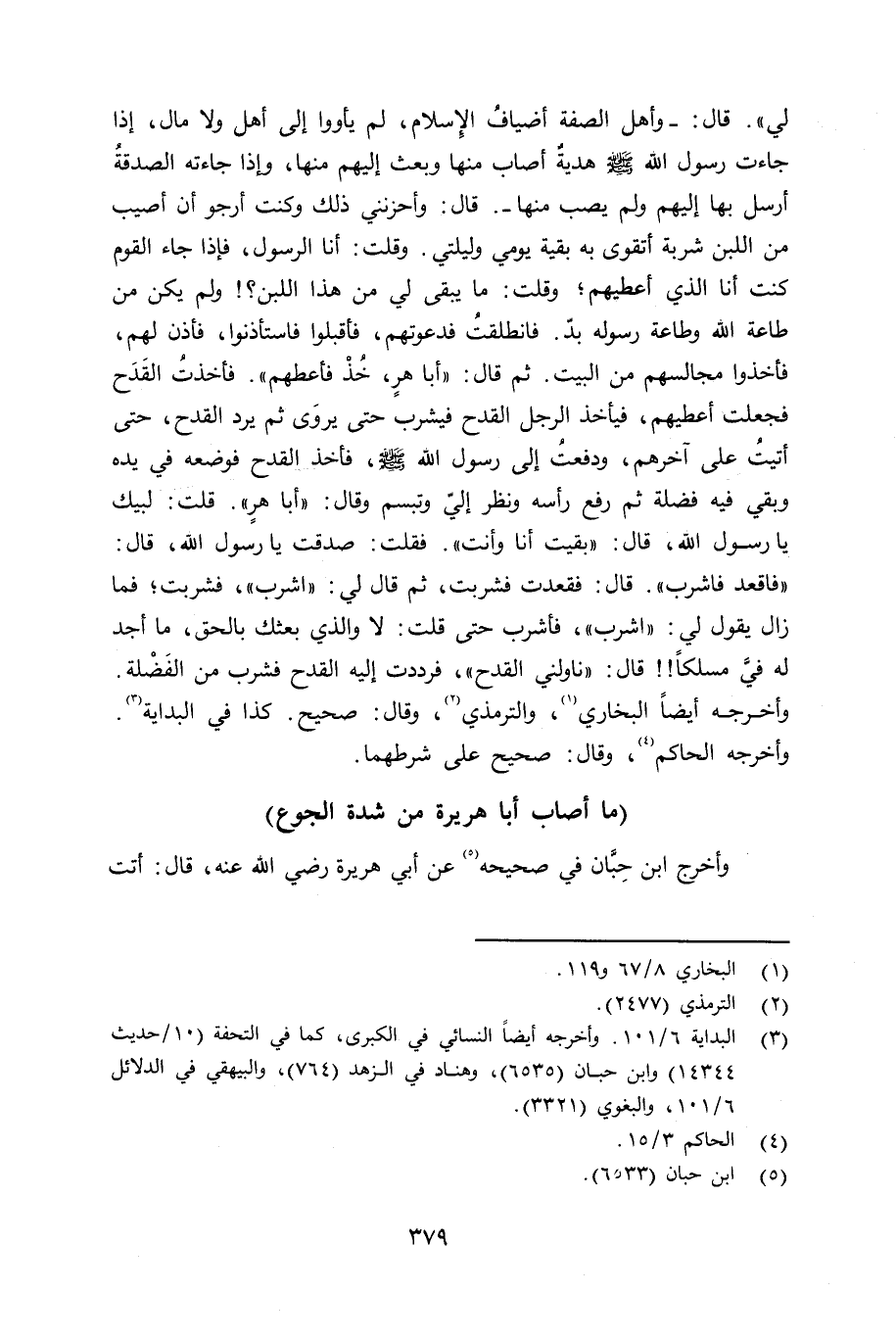 رأسه ونظر إليّ وتبسم وقال: «أبا هرّ» قلت: لبيك رسول الله، قال: «بقيت أنا وأنت» . فقلت؛ صدقت يا رسول الله، قال: «فاقعد فاشرب» قال: فقعدت فشربت، ثم قال لي: «شرب» ، فشربت؛ فما زال يقول لي: «إشرب» ، فأشرب حتى قلت: لا والذي بعثك بالحق، ما أجد له فيّ مسلكاً قال: «ناولني القدح» ، فرددت إليه القدح فشرب من الفَضْلة، وأخرجه أيضاً البخاري؛ والترمذي وقال: صحيح كذا في البداية. وأخرجه الحاكم وقال: صحيح عى شرطهما.