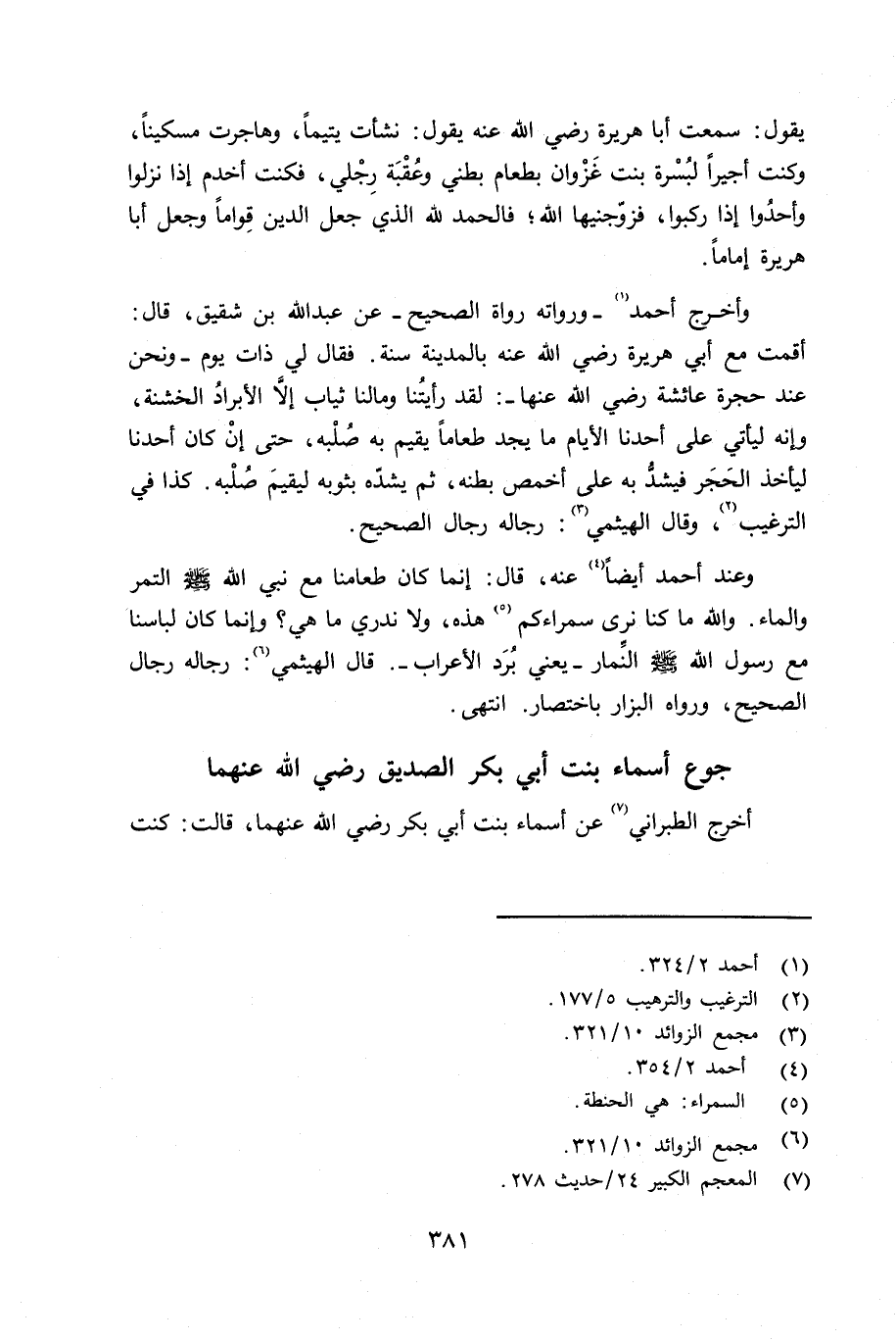 وأخرج أحمد - ورواته رواة الصحيح - عن عبد الله بن شقيق قال: أقمت مع أبي هريرة رضي الله عنه بالمدينة سنة. فقال لي ذات يوم - ونحن عند حجرة عائشة رضي الله عنها -: لقد رأيتُنا وما لنا ثياب إلا الأبرادُ الخشنة، وإنه ليأتي على أحدنا الأيام ما يجد طعاماً يقيم به صلبه، حتى إنْ كان أحدنا ليأخذ الحجر فيشدّ به على أخمص بطنه، ثم يشدّه بثوبه ليقيم صلبه. كذا في الترغيب. وقال الهيثمي: رجاله رجال الصحيح، وعند أحمد أيضاً عنه قال: إنما كان طعامنا مع نبي الله صلى الله عليه وسلم التمر والماء. والله ما كنا نرى سمراءكم هذه، ولا ندري ما هي؟ وإنما كان لباسنا مع رسول الله صلى الله عليه وسلم النِّمار - يعن بُرَد الأعراب -. قال الهيثمي: رجاله رجال الصحيح. ورواه البزار باختصار. انتهى.